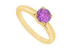 A vibrant round Amethyst is prong-set in the center. This sleek gemstone solitaire ring is made in 14K yellow gold and has a total gem weight (TGW) of 1.00 ct.