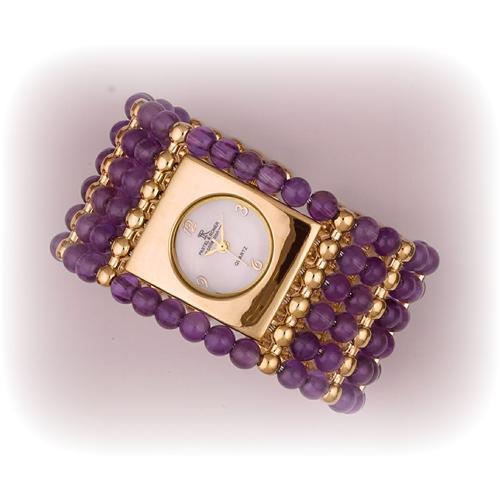 This exquisite watch is fashioned from genuine Amethyst and it is set with simulated diamonds for lots of sparkle. The square bezel and Amethyst bead bangle band create a feminine, stylish watch. Comfortable, adjustable bangle band fits all wrists. Includes 1 year Manuf. Warranty. All items are brand new and include our Satisfaction Guarantee: if you don't LOVE your item, simply return it for a full refund of your purchase price (less shipping).