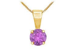 A round natural amethyst is securely held in a luscious 14K yellow gold prong setting. This gemstone pendant has a total weight (TGW) of 1.00ct and comes with a standard 16 14K yellow gold chain.