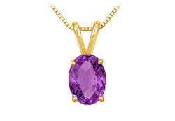 An oval natural amethyst is securely held in a luscious 14K yellow gold prong setting. This gemstone pendant has a total weight (TGW) of 1.00ct and comes with a standard 16 14K yellow gold chain.