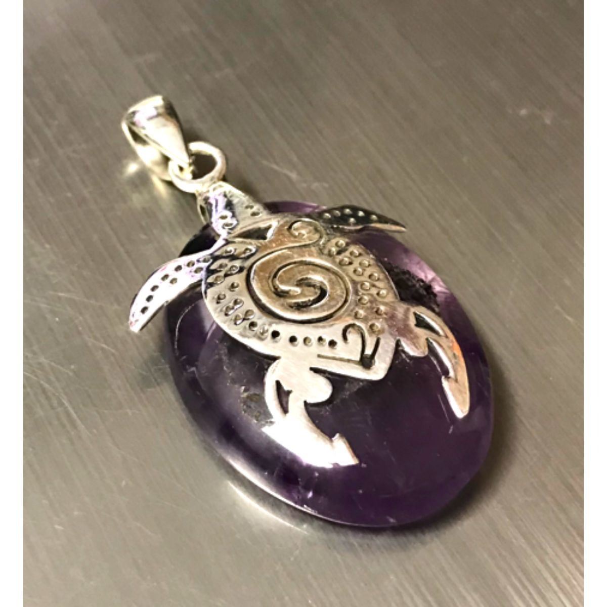 Amethyst crystal ( Super Seven / Melody's Stone ) oval cabochon set into a stamped 925 sterling silver pendant with abstract turtle design. 1 3/4" L. 10.3 grams weight, gemstone & silver. "Super Seven", also known as Melody Stone or Sacred Stone, is an extremely rare mineral with seven crystals in one. The crystals are Amethyst, Cacoxenite, Goethite, Lepidocrocite, Rutile, Smoky Quartz, and Quartz. It shares the healing and metaphysical properties of each combined stone, said to aid in the healing of physical, intellectual and spiritual diseases.