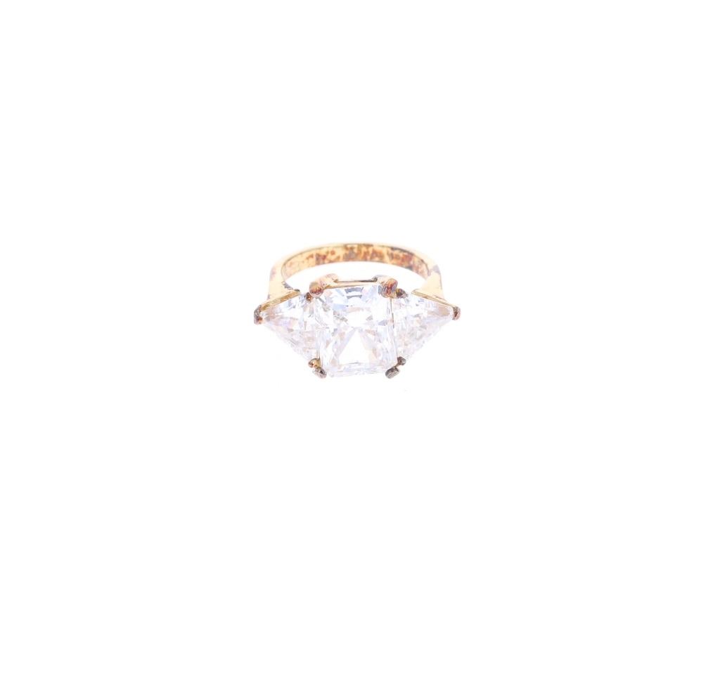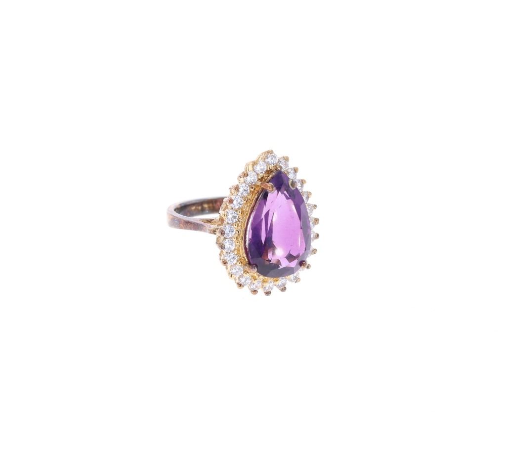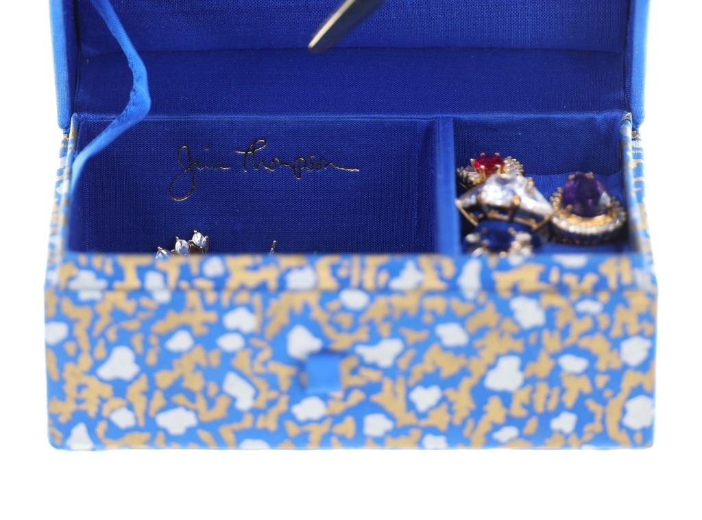 Featured in this lot is this Fashion Jewelry or Costume Jewelry amethyst, blue topaz, and ruby rings with earrings. The collection features a total of four rings and two pairs of earrings. The four rings a gilt sterling silver ring bands and faces with on showing a pear cut amethyst, one showing a round blue topaz, and the last showing a round ruby. The last ring and the two pairs of earrings show glass place holding gemstones. All of the rings are Marked as follows: .925 PC. The jewelry collection is showcased in a blue leopard print box marked Julie Thompson. The condition of this collection of Fashion Jewelry is good with only one of the earring missing some small placement holding stones but otherwise shows a good overall condition. The measurements of this collection ranges from 1 1/8" x 1" x 3/8" to 1" x 3/4" x 7/8" and a ring size of US 5-5 1/2 for the rings. The collective weight of this collection is 28.4g. Provenance: From a prominent ex-Bozeman private collection who purchased the majority of his collection from Cowan's, Skinner, Bonhams, Morphy's, Sotheby's, March in Montana, North American Auction and other well revered auction houses.