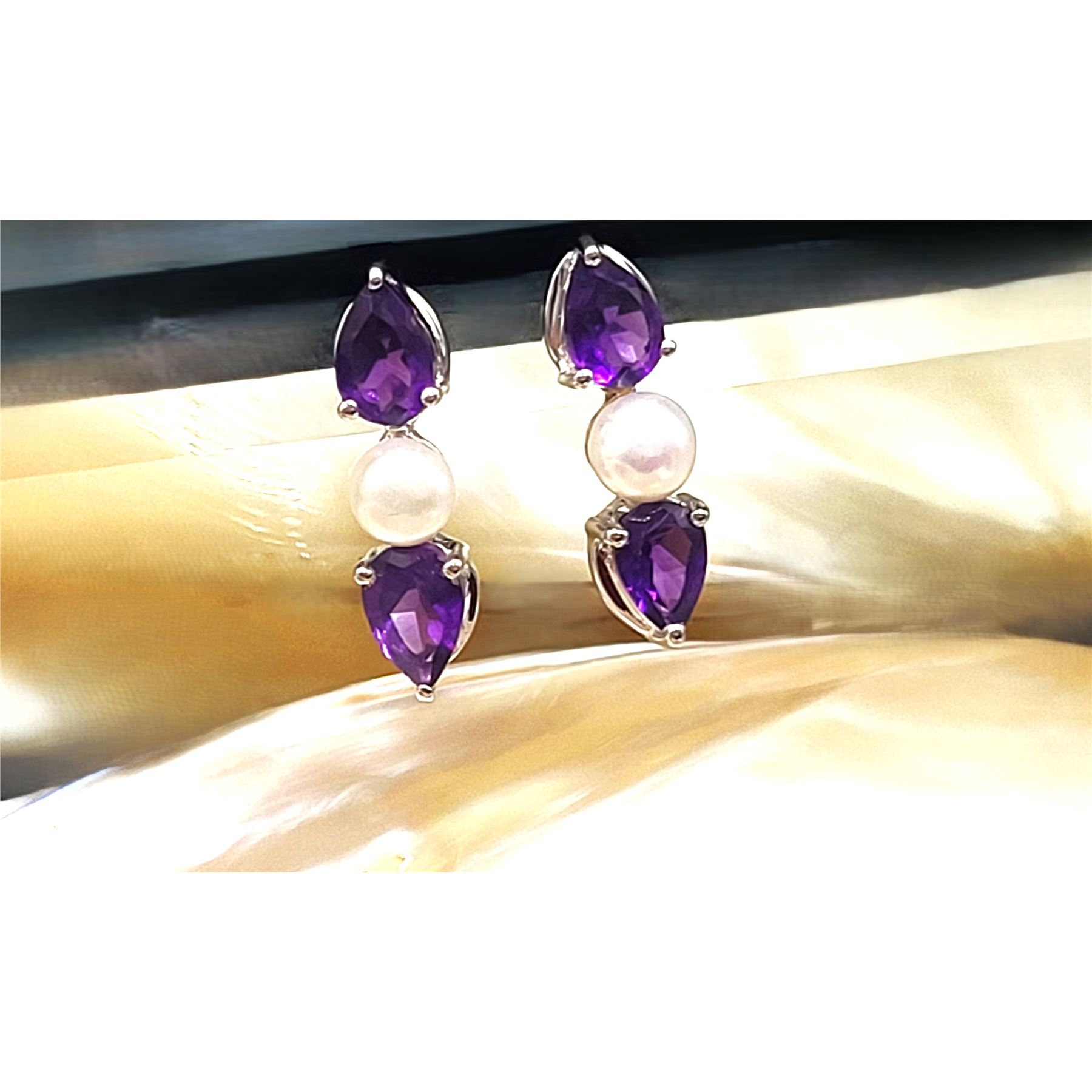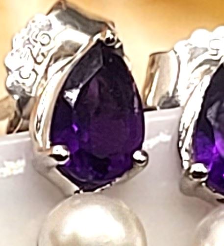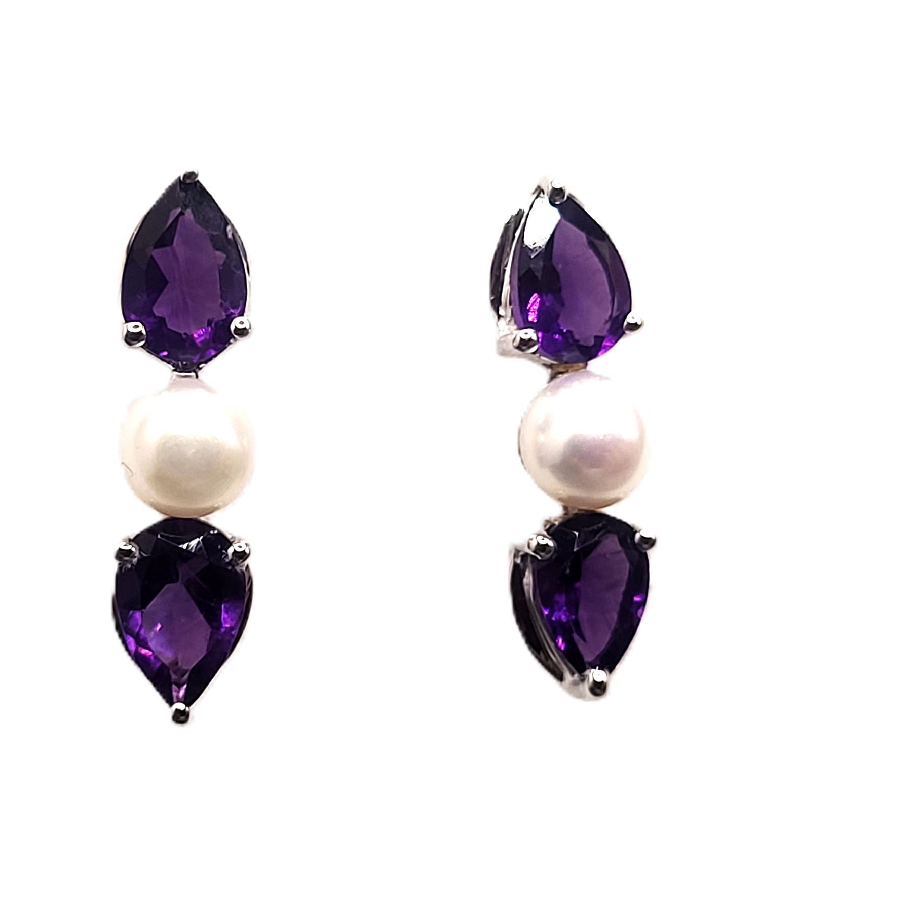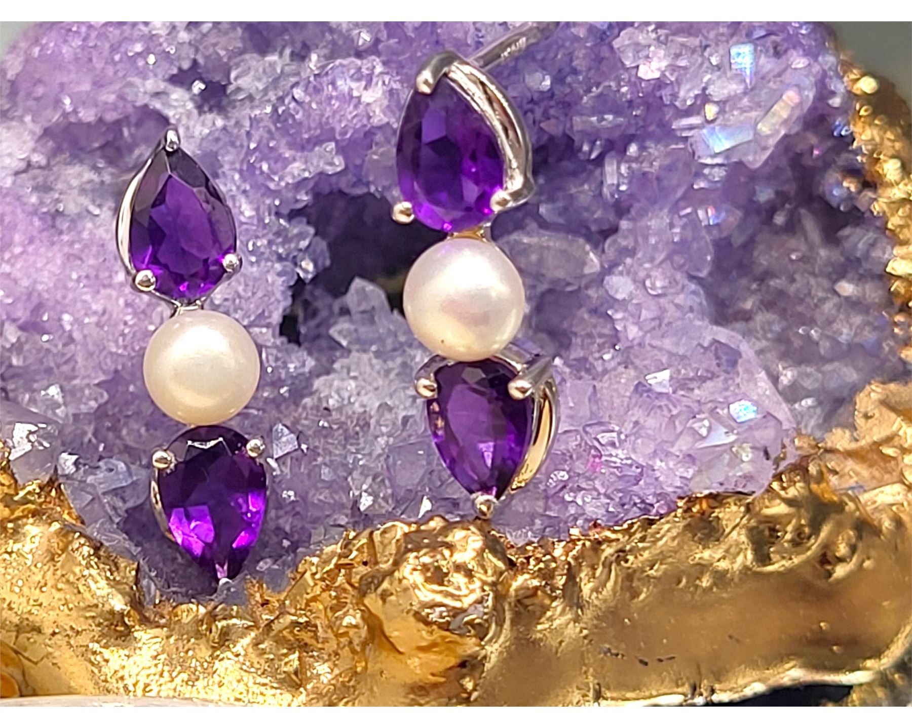 The contrast between the reflective, vivid purple surface of the 1.48 carats total weight (about .37 carat each) pear-cut amethysts and the shimmery, soft glow pinkish glow of the cultured pearls (4.5mm each) is stunning. Colors and mixed textures such as these, pair with so many clothing styles, the opportunities to wear them will be endless.& nbsp; The earrings are approximately 3/4' long and attach to the earlobes with posts and friction backs.& nbsp; Admin: KQ/lb