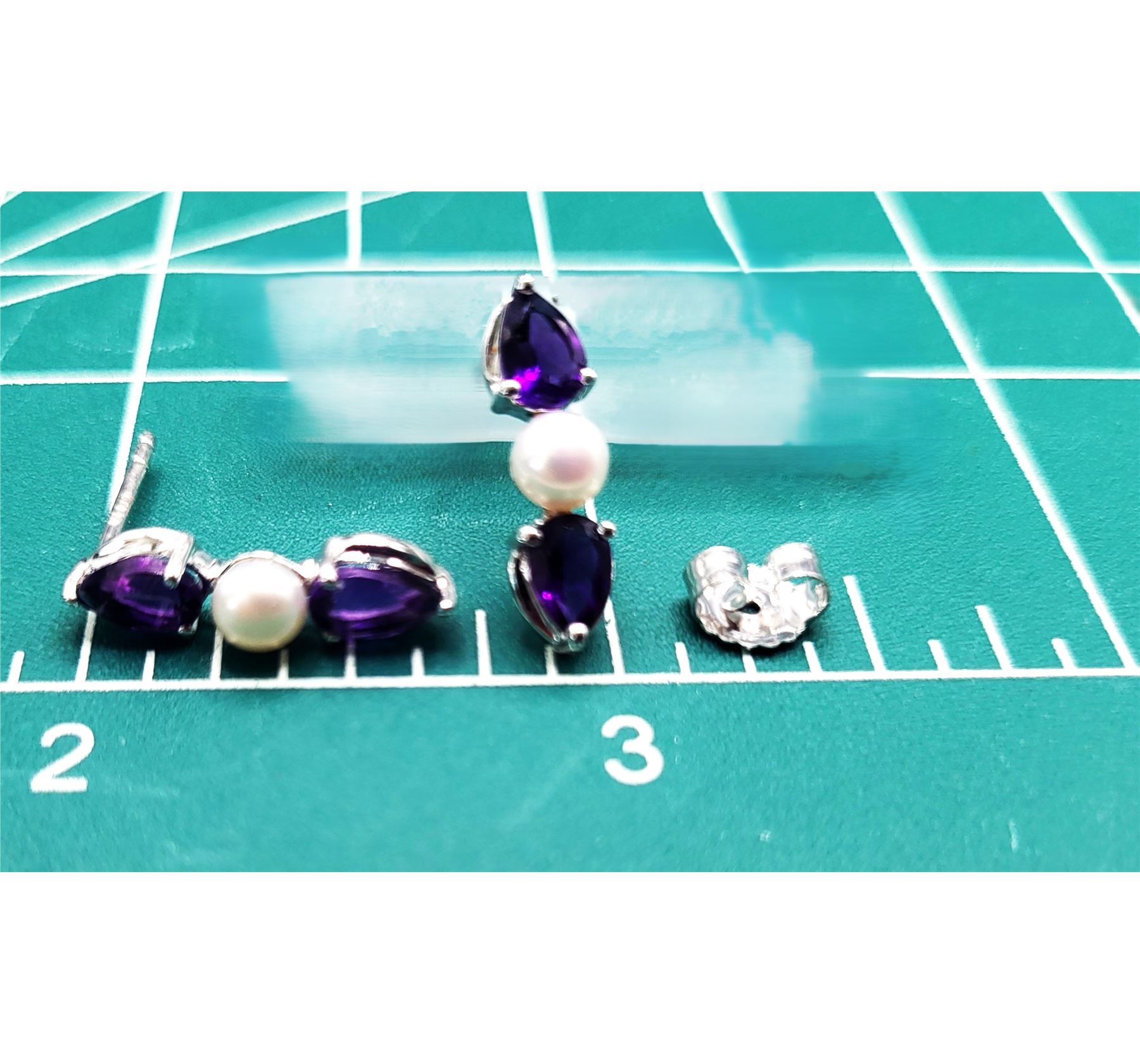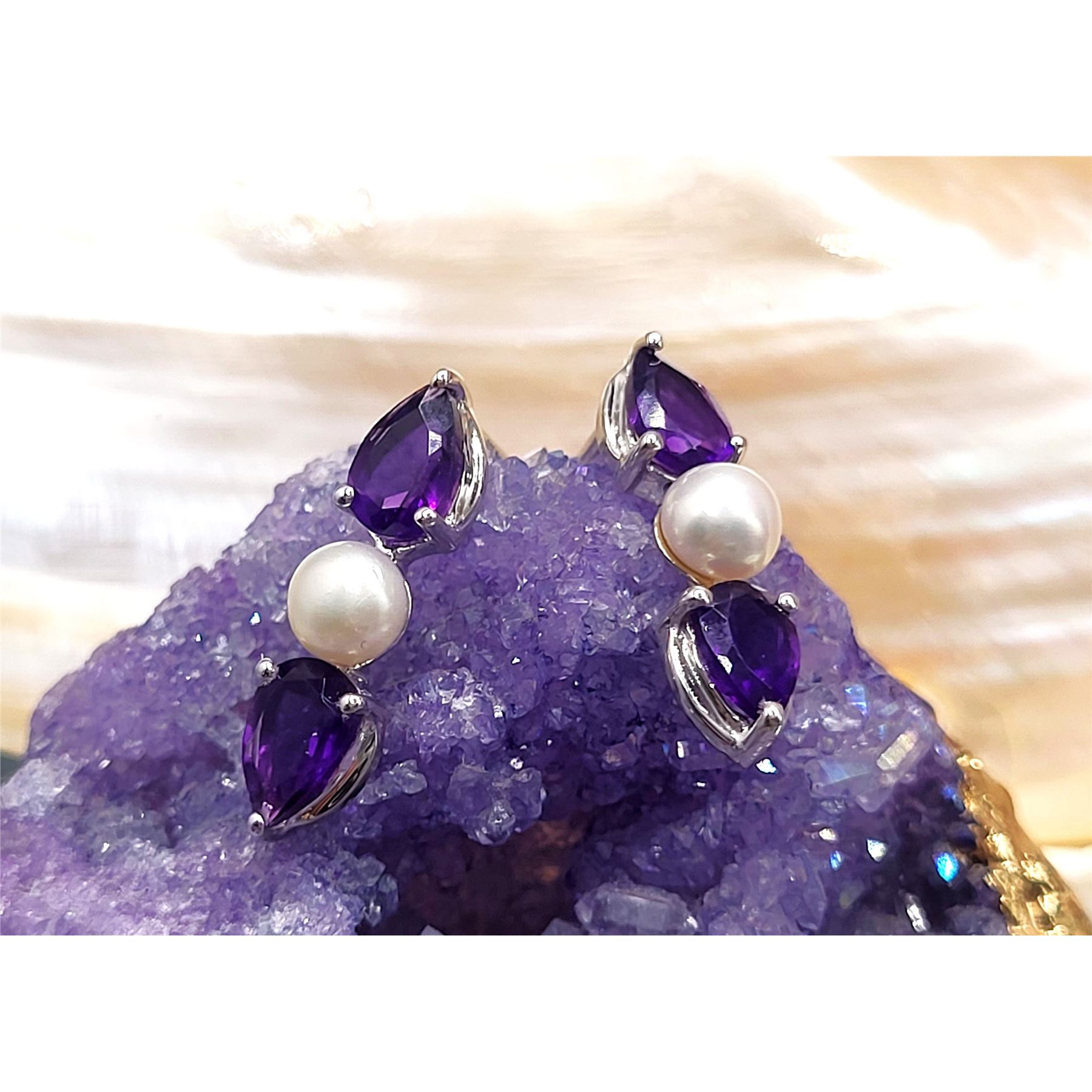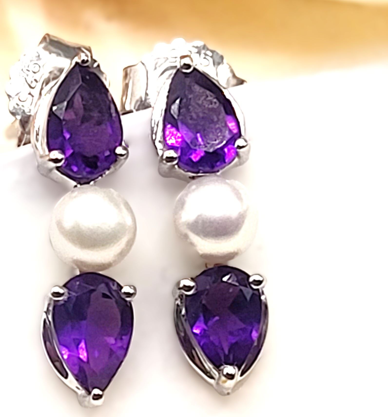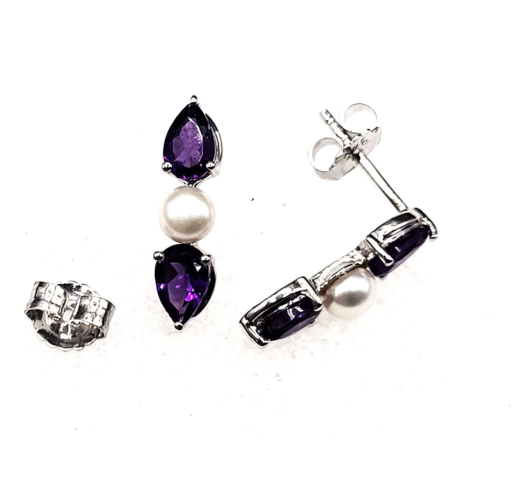 The contrast between the reflective, vivid purple surface of the 1.48 carats total weight (about .37 carat each) pear-cut amethysts and the shimmery, soft glow pinkish glow of the cultured pearls (4.5mm each) is stunning. Colors and mixed textures such as these, pair with so many clothing styles, the opportunities to wear them will be endless.& nbsp; The earrings are approximately 3/4' long and attach to the earlobes with posts and friction backs.& nbsp; Admin: KQ/lb