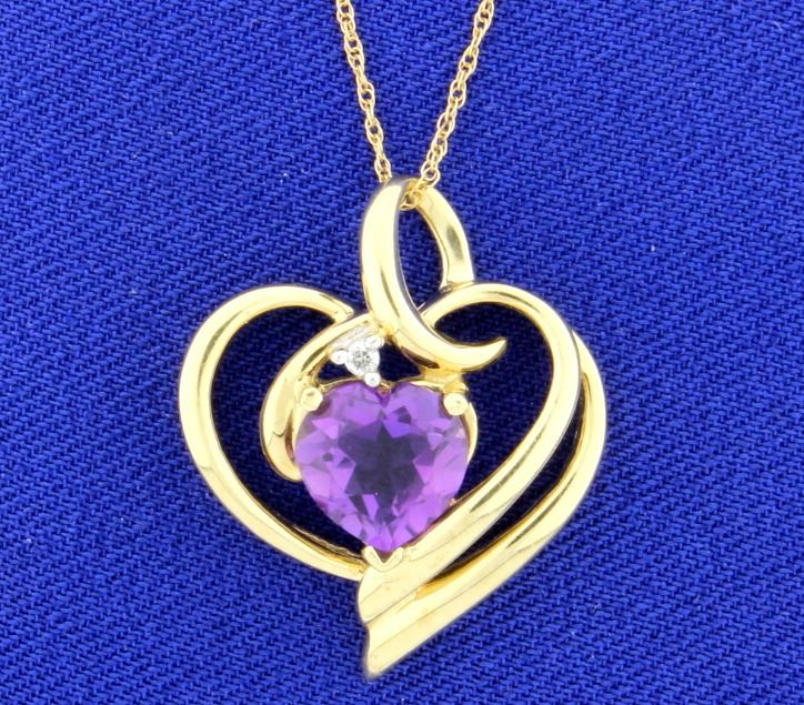 Amethyst and diamond 10k yellow gold pendant. The amethyst 7mm x 7mm heart. Approx. weight is 1.25 carats. There is one diamond, single cut 0.015 carats. The 10k yellow gold chain is 18 inches in length.