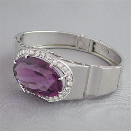 A very fine amethyst and diamond set bangle bracelet with platinum hand made mountings, Circa 1960. The bracelet is plain and polished with a clip at each shoulder. The clasp is a double hinge type with bottom sleeve type clasp and a safety chain can be added. The centre is set with a fine quality genuine amethyst (30mm x 20mm). This is surrounded in an undulating pattern with thirty-two (32) matched brilliant cut diamonds. An elegant bracelet for any formal occasion.