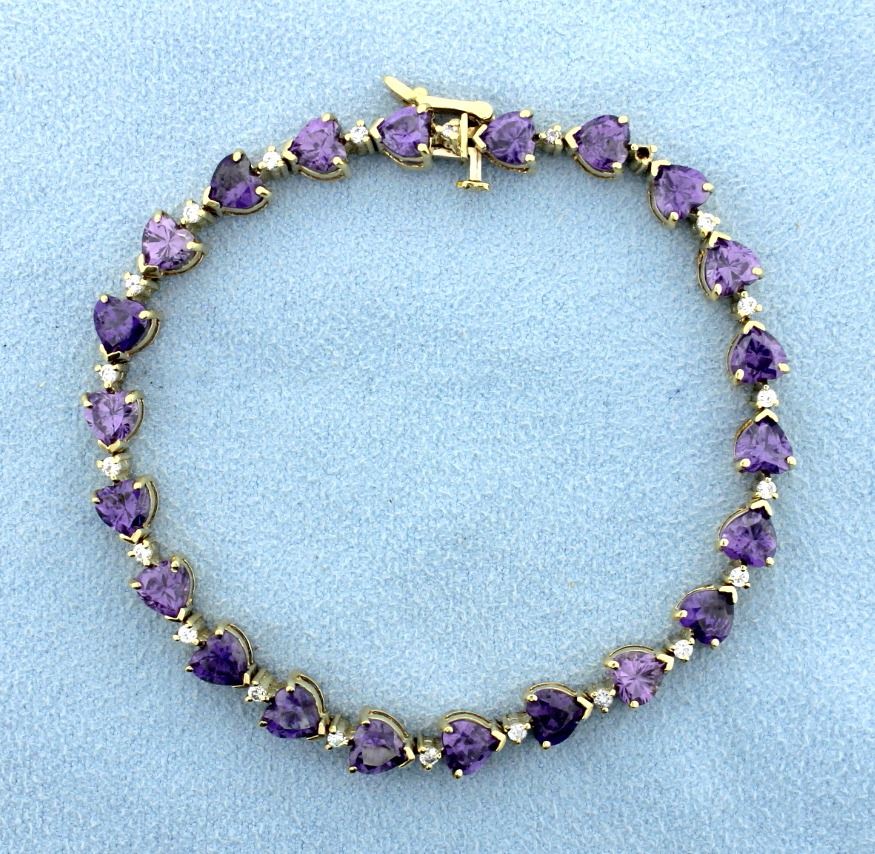 14k Yellow Gold Bracelet featuring 22 heat shaped amethyst gemstones (6mmx5.25mm) and 21 diamonds totaling 1/4 ct. 7.25 inches long. Has safety clasp. 13.1g