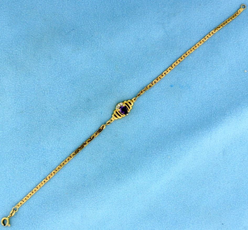 In 14k yellow gold. Contains a natural 6x5mm high quality pear shaped amethyst gemstone with bright purple color. Also contains three high quality .01ct diamonds. 7 3/4" long. 3.2g.