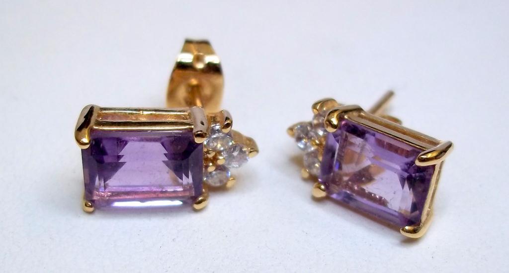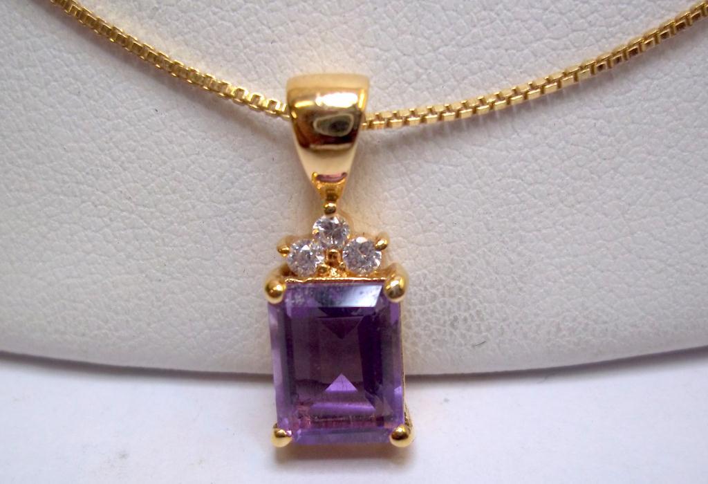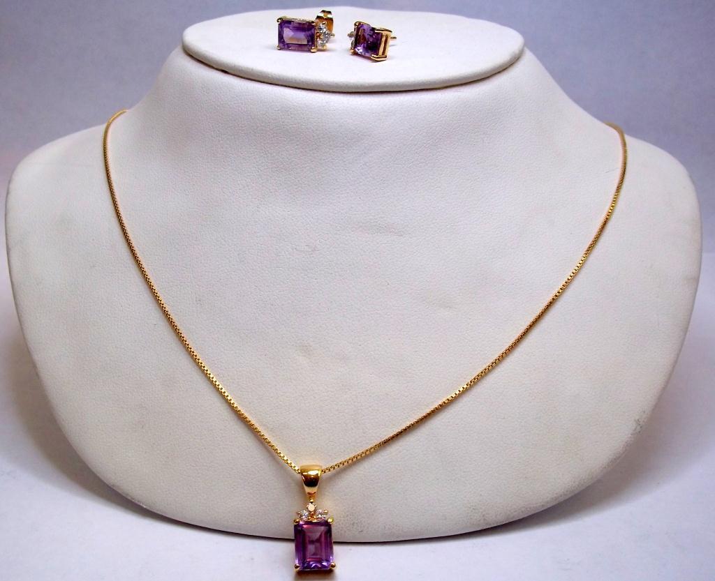 Italian Gold/Vermeil, Genuine Amethyst & Diamonds, Pendant, Chain,Pierced Earring Set.