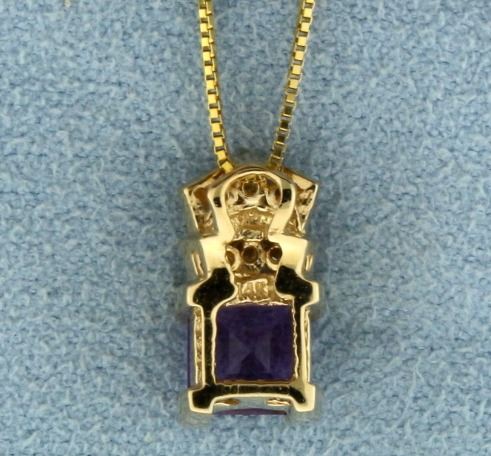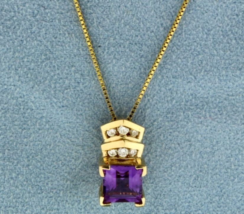 In 14k yellow gold, contains a 1.5ct high quality square shaped natural amethyst gemstone with bright purple color and excellent clarity. Also contains six high quality round brilliant diamonds, .06ct TW with VS clarity/H color. Comes with 18 inch long 14k gold chain. 3.1g