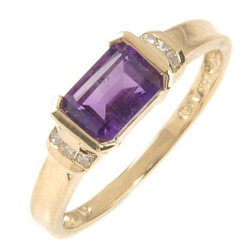 Size 7: One emerald cut, 1.1ct. deep purple amethyst and six round .05ct. diamonds are set in 14kt. yellow gold.