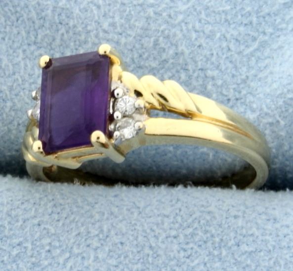 In 14K yellow gold, there is a 7.75 x 6mm emerald cut Amethyst approx. 1.5ct-deep color & great clarity! Also there are four .01ct diamonds. Size 6 3/4 3.3g