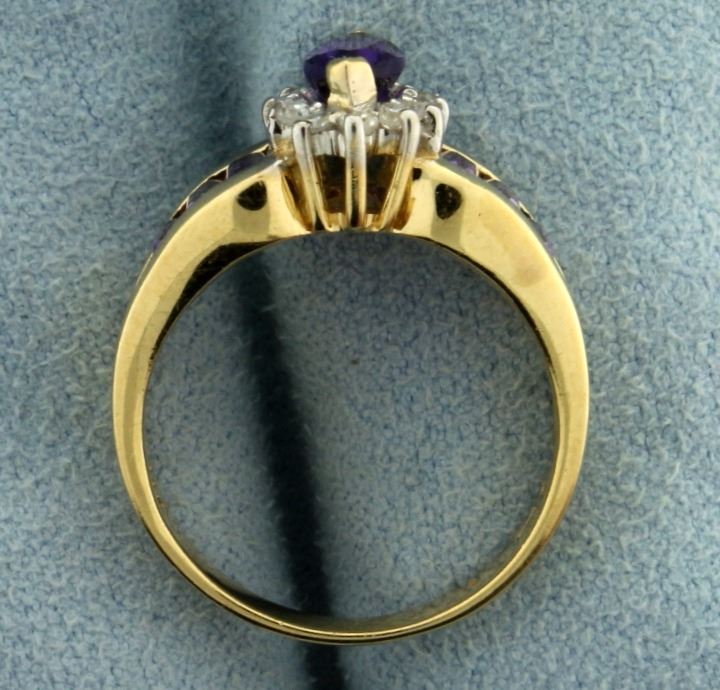 In 14k yellow gold. Contains a 3/4 ct marquise shaped natural amethyst with vibrant purple color and excellent clarity. Surrounded by fourteen high quality .01ct diamonds, SI clarity/H color. Band also contains 4x2mm high quality natural baguette amethyst gemstones. 4.6g.