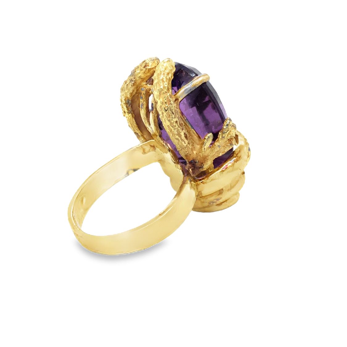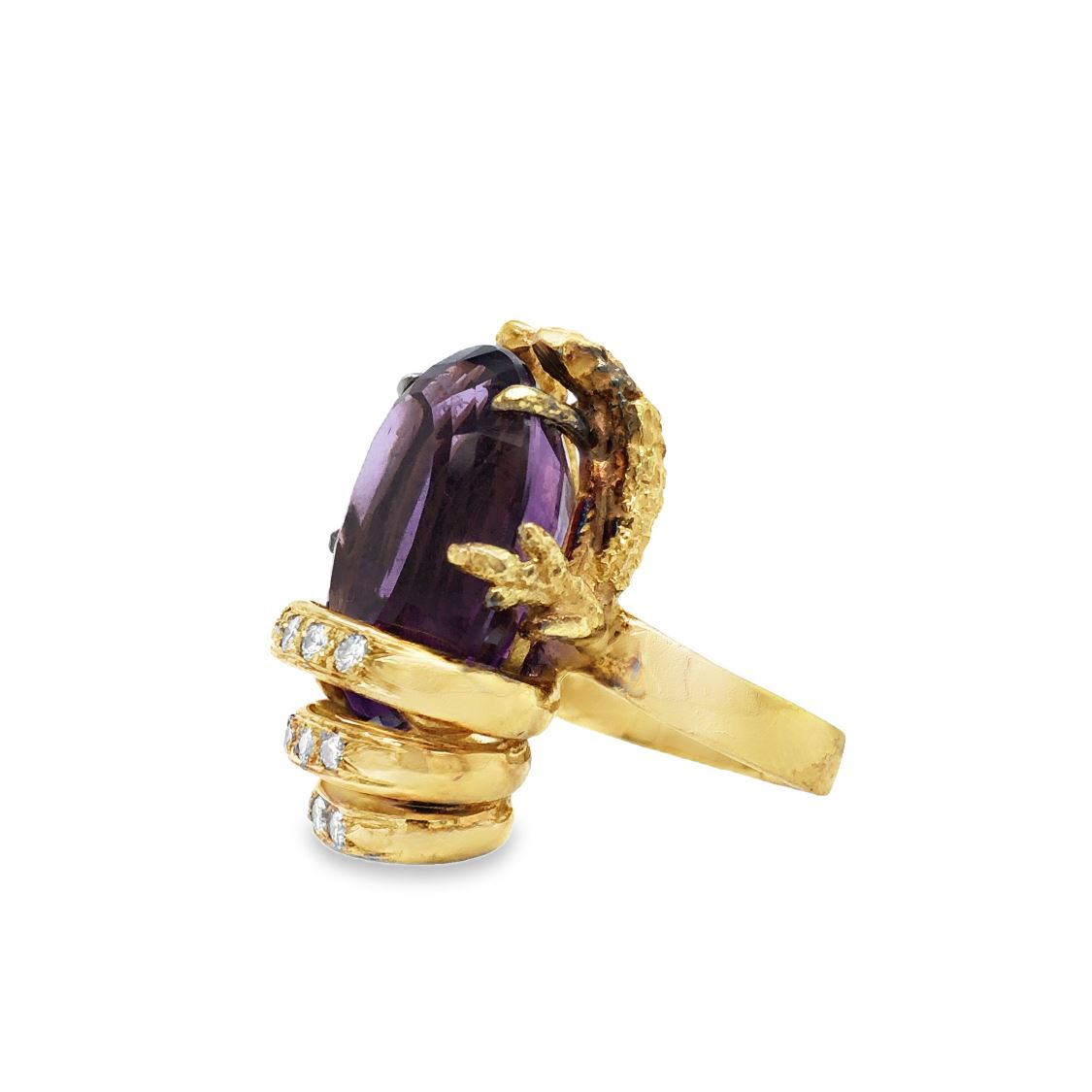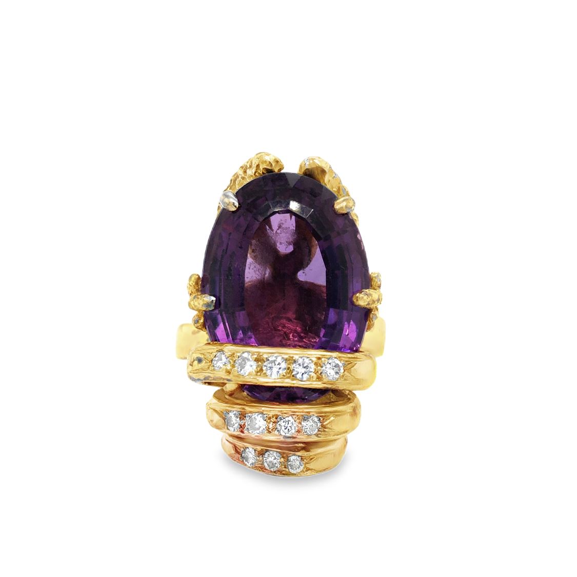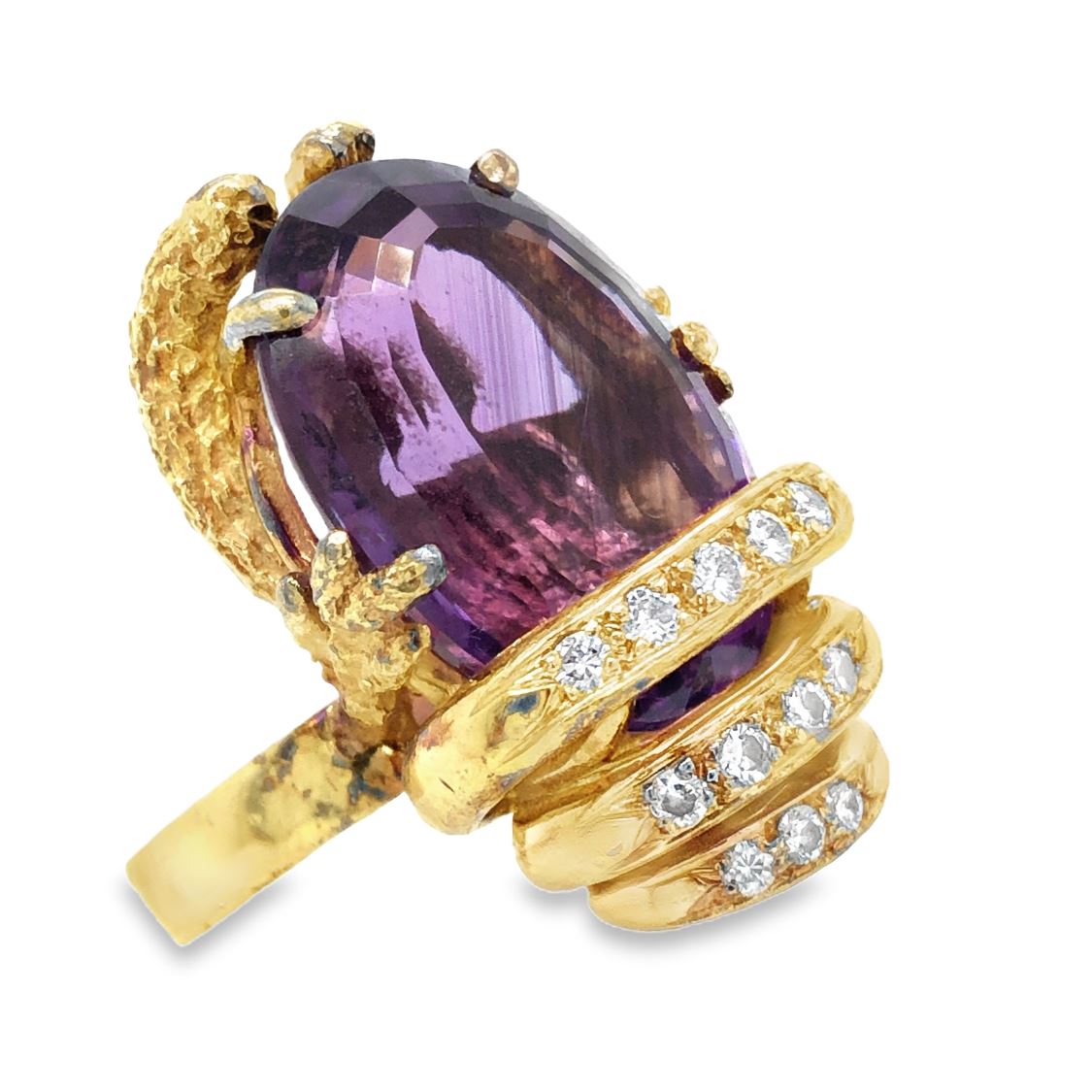 DESCRIPTION DETAIL: A statement ring with 3 spiraling rows of diamonds set to compliment a 10-carat, natural amethyst.
