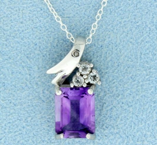 The emerald cut 2.2ct amethyst gemstone has three white topaz gems above it as well as a diamond on the bale. They are in platinum over sterling silver with a 18" sterling chain. 2.3g