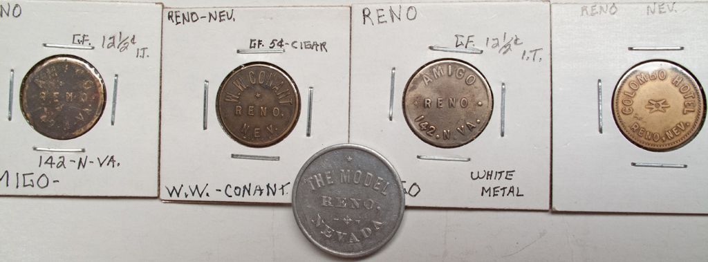 Lot of five. 1) Amigo / Reno / 142 W. Va. //GF 12 1/2c IT. White metal. 2) Same as number one, but worn. 3) The Model / Reno /Nevada // GF one cigar. 4) W. W. Conant / Reno / Nev // GF 5c cigar. 5) Colombo Hotel / Reno, Nev // GF 5c IT.City: RenoCounty: WashoeState: NVDate: