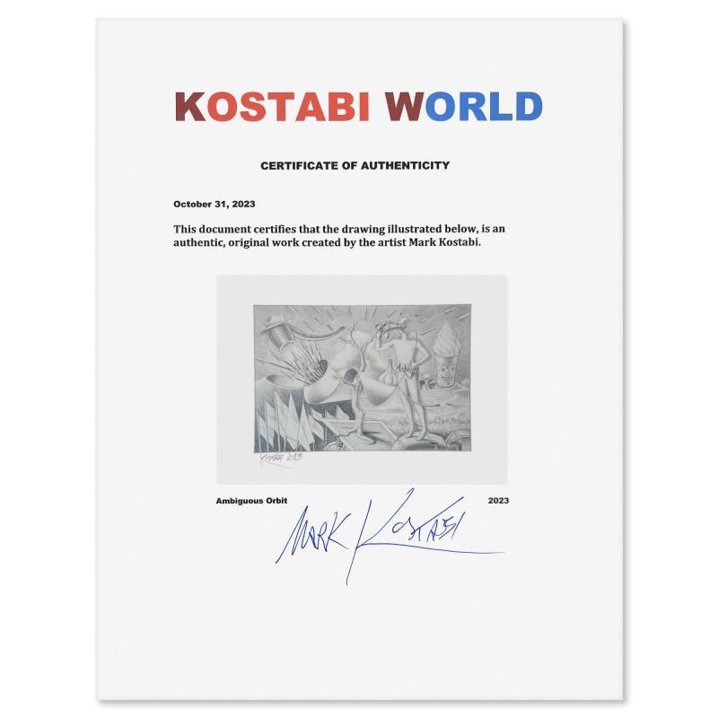 "Amiguous Orbit" is an original drawing on paper by Mark Kostabi, hand signed by the artist. This piece comes custom framed and includes a certificate of authenticity. Measures approximately 14.5" x 17" (frame), 8.5" x 11" (image). This item requires special handling and may have a longer than usual turnaround.