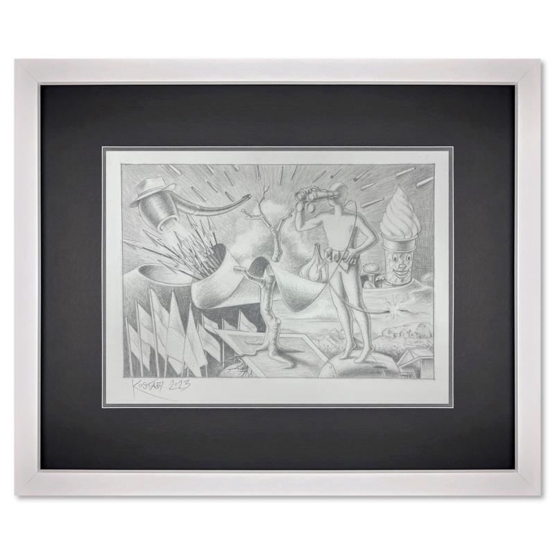 "Amiguous Orbit" is an original drawing on paper by Mark Kostabi, hand signed by the artist. This piece comes custom framed and includes a certificate of authenticity. Measures approximately 14.5" x 17" (frame), 8.5" x 11" (image). This item requires special handling and may have a longer than usual turnaround.
