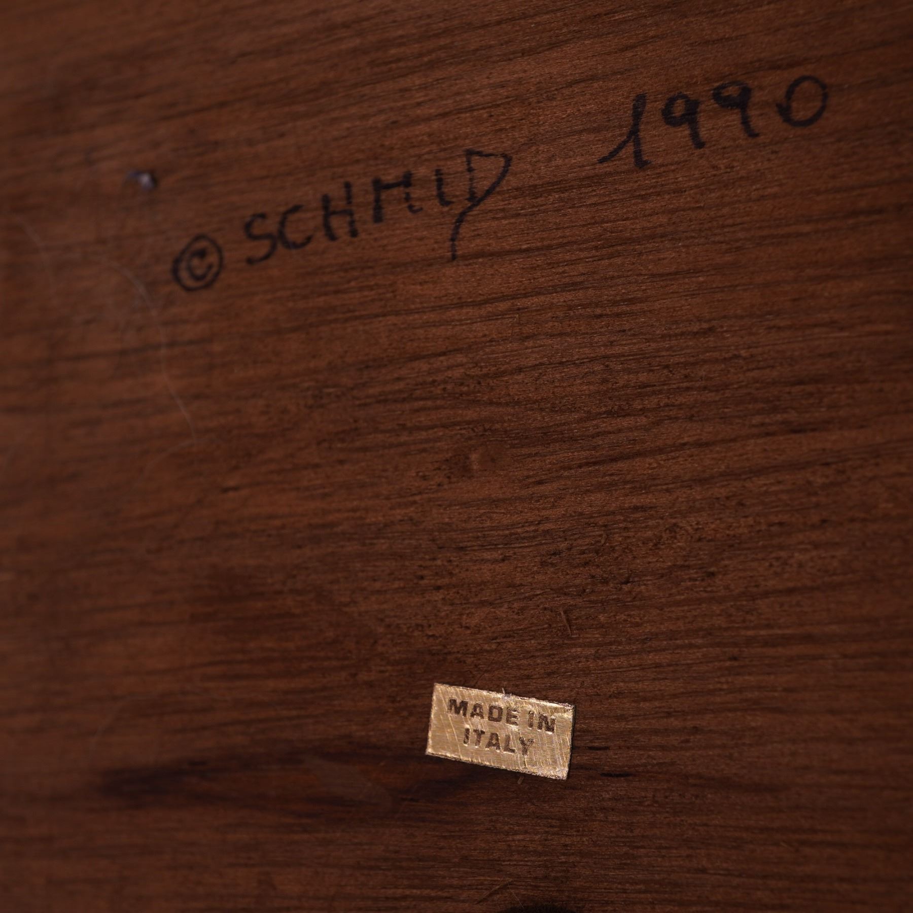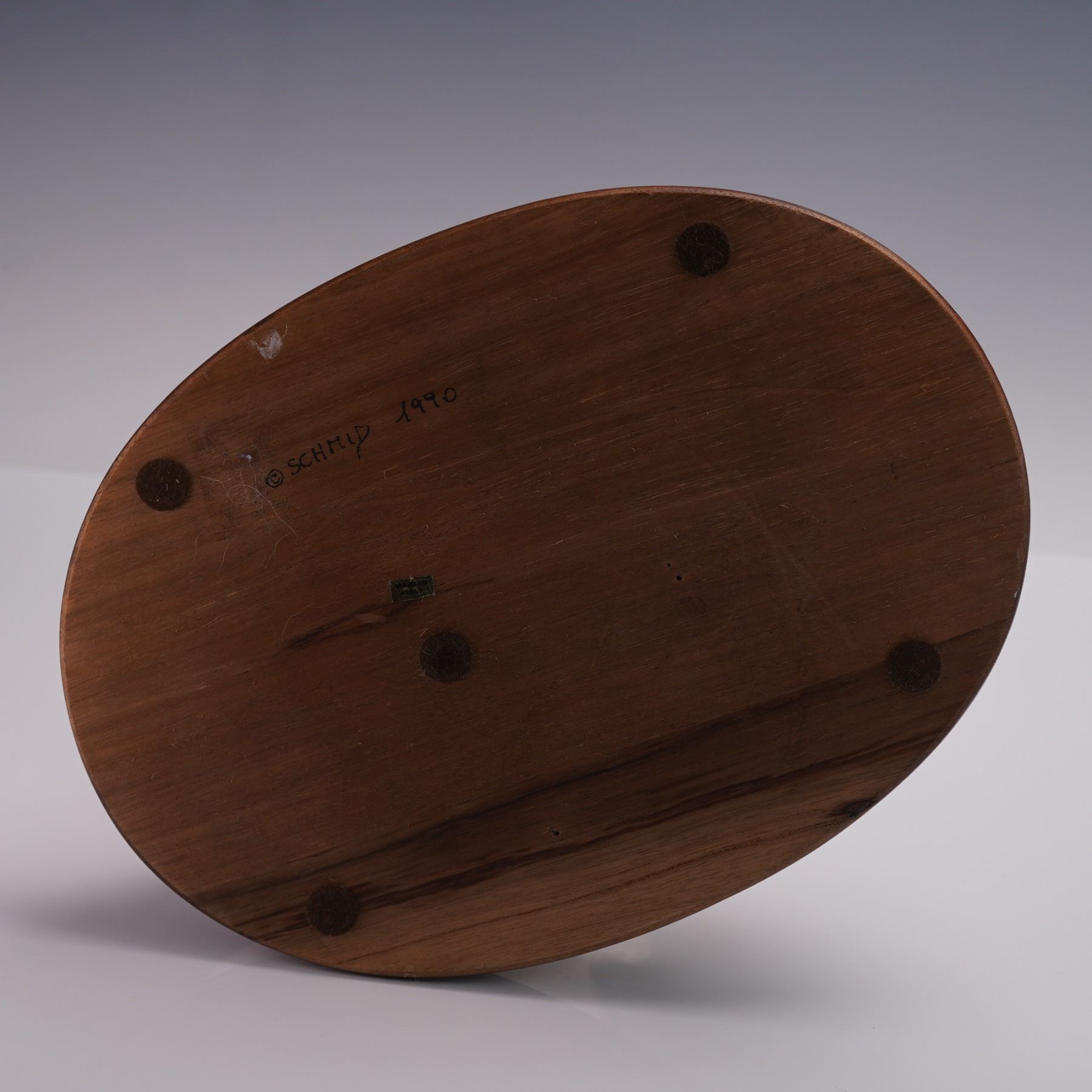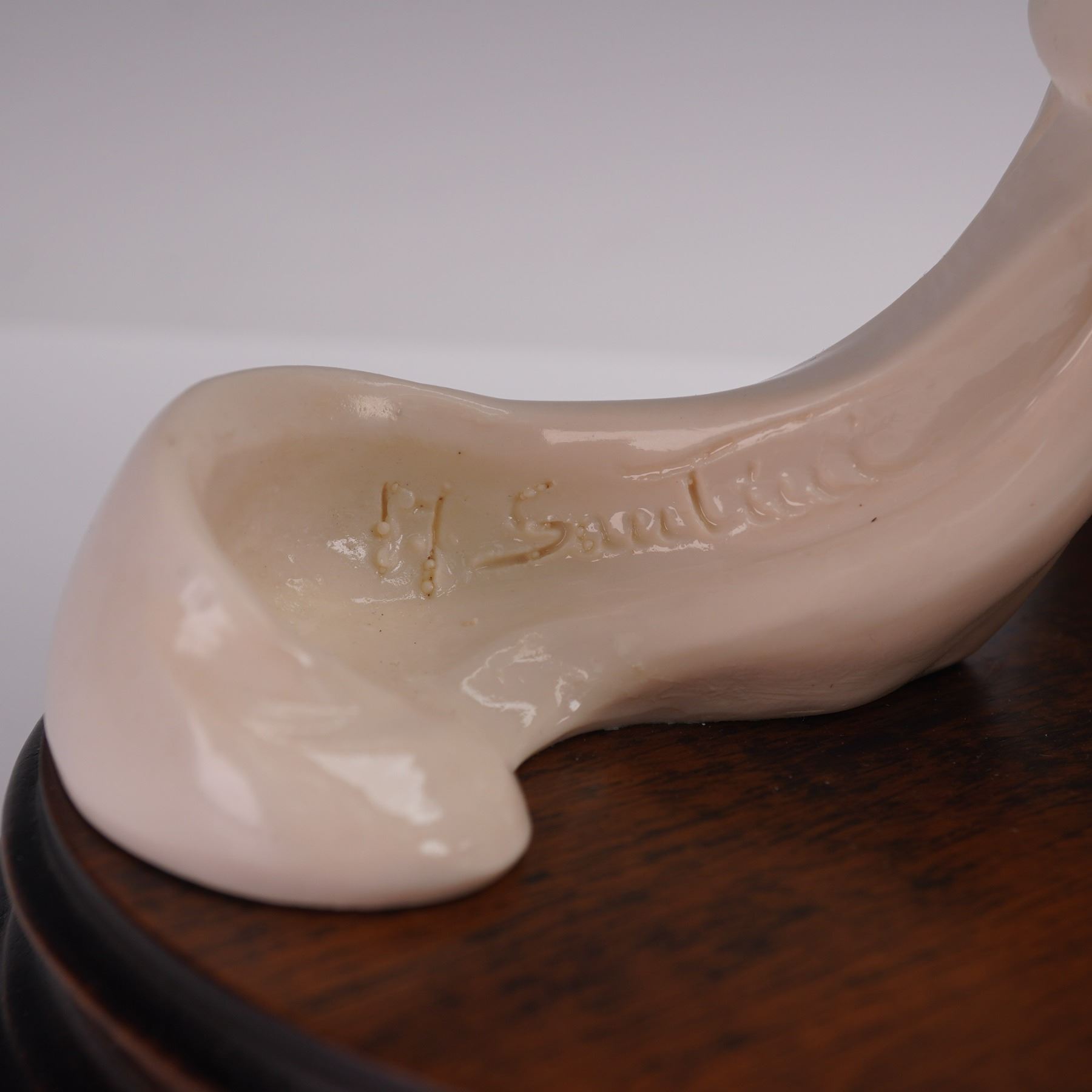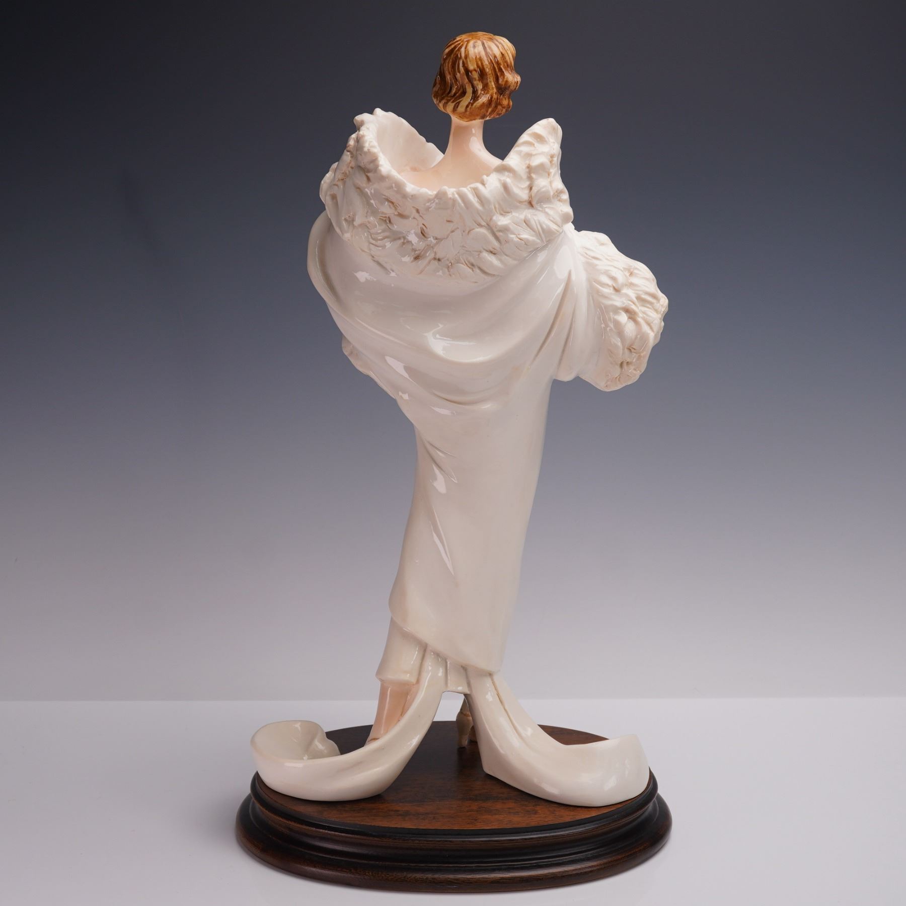 Handcrafted porcelain sculpture depicting a standing woman in an elegant gown with a feathered boa. Signed A. Santini on the bottom of the gown. Mounted on a wooden stand marked Schmid 1990 with a Made in Italy label.