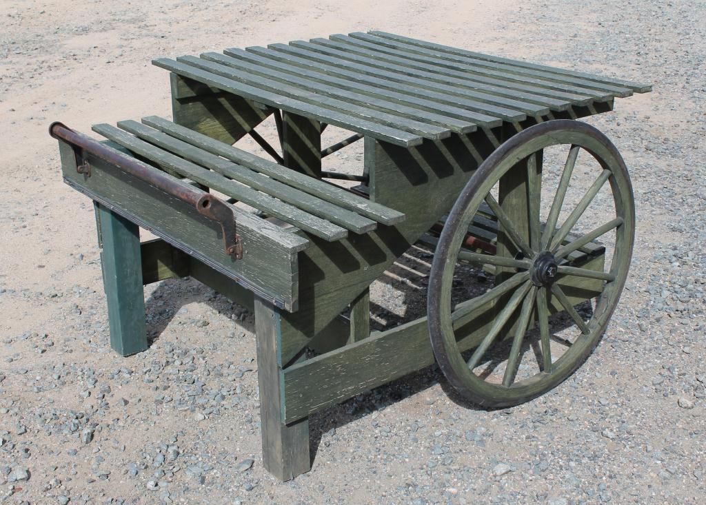 Green painted finish, wagon wheels. Could be used as a plant stand, yard art, or a BBQ buffet. BUYER TO MAKE ARRANGEMENTS FOR CRATING AND SHIPPING.