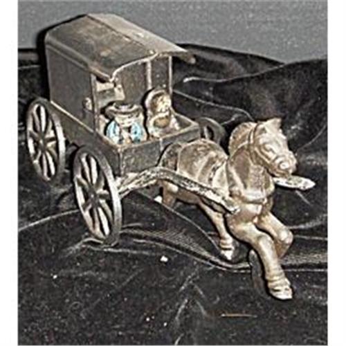 This is a reproduction Amish buggy with horse, driver and passengers. His wife sits beside him in front and two children are painted in the back. It is an art form from yesteryear and would be delightful in a childs' room...