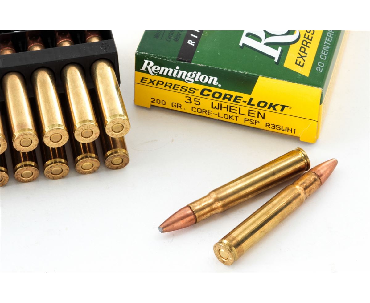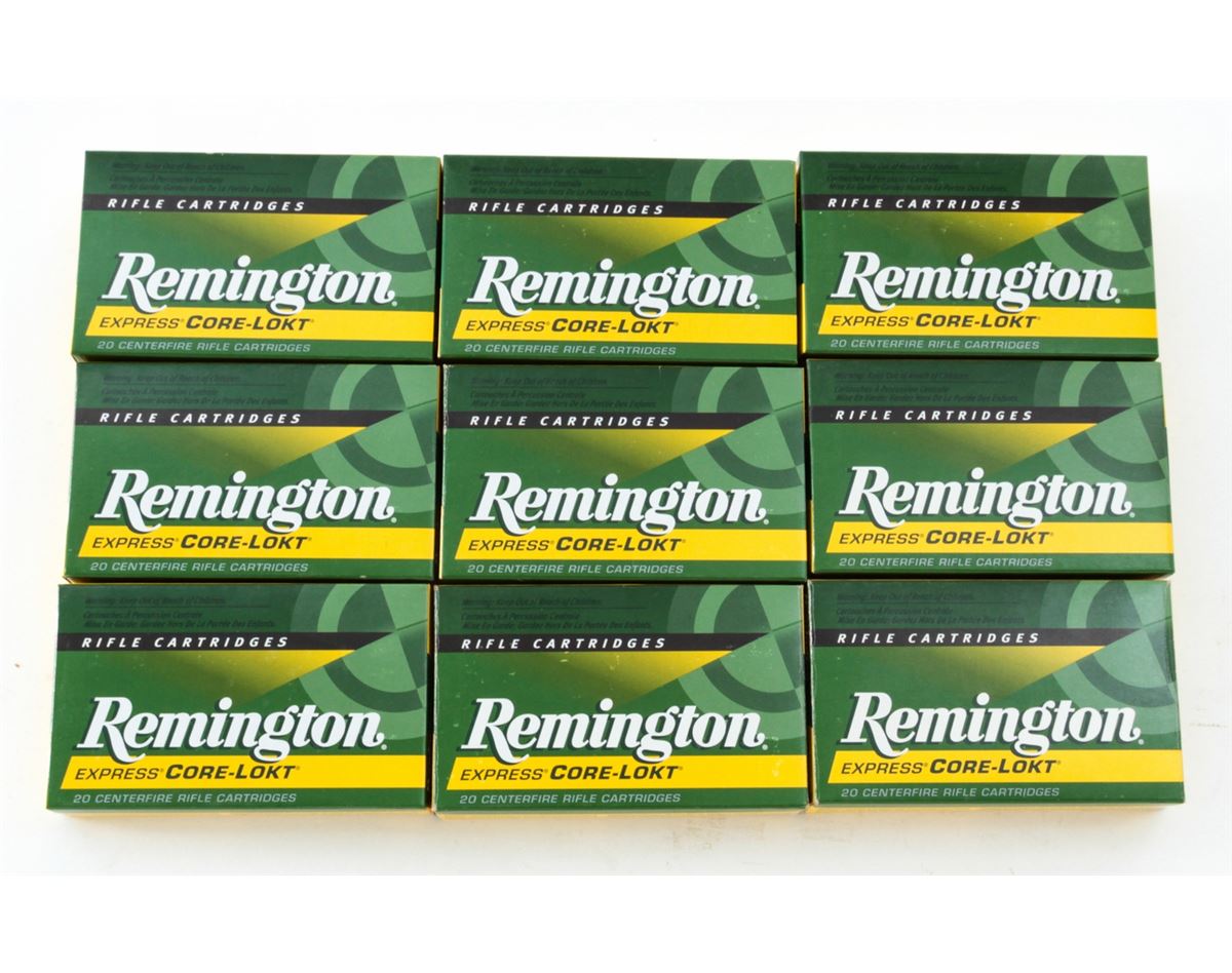 Ammo Lot: Nine (9) Boxes (180 rds.) Remington .35 Whelan 200 grain Express Core-Lokt cartridges, #R35WH1. All brand new in original boxes. Retails @ $325/lot. Est.: $200-$300/lot. (Field Time)