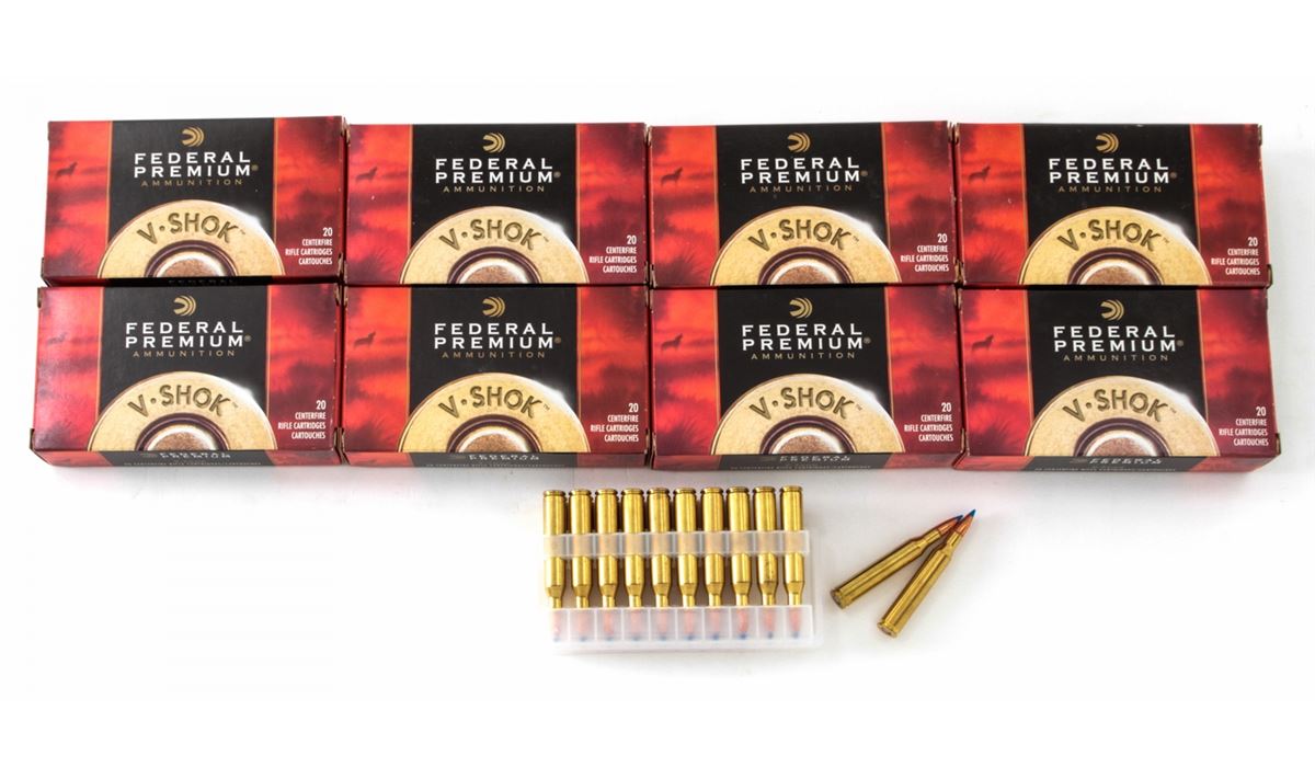 Ammo Lot: 160 Rounds of Federal Premium V-Shok .25-06 Rem. 85-grain Nosler ballistic tip cartridges. Eight (8) 20-round boxes, all brand new in original packaging. Retails @ $340/lot. Est.: $225-$325/lot. (Field Time)