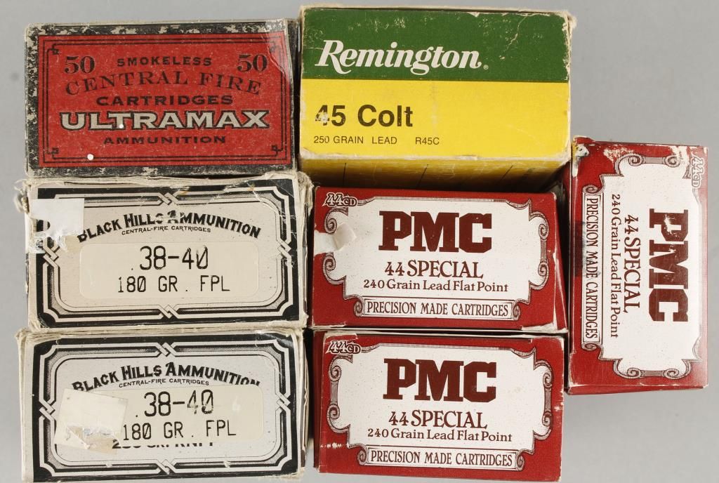 .38-40 180 gr. FPL 100 rounds, 44 special 240 grain lead flat point 150 rounds, 45 colt 250 gr. 100 rounds.