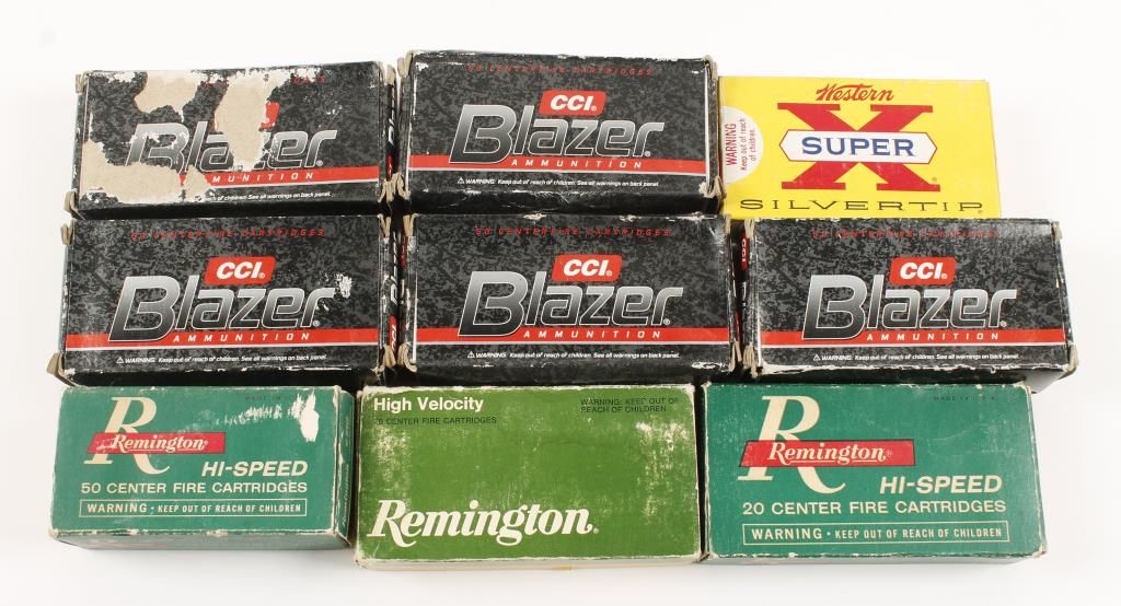 (5) Boxes of 50 rounds (250) total Blazer 38 SP+P. 125 grain TMJ. (1) Box of (50) Remington Hi-Speed 32-20 Win 100 grain soft point. (1) Box of (20) Western Super X Silvertip 308 Winchester 150 Gr Expanding bullet. (1) Box of (20) Remington Hi-Speed 308 Win 180 Gr Soft Point Core-Lokt. (1) Box of (20) Remington 243 Win 100 gr Core-Lokt soft point.