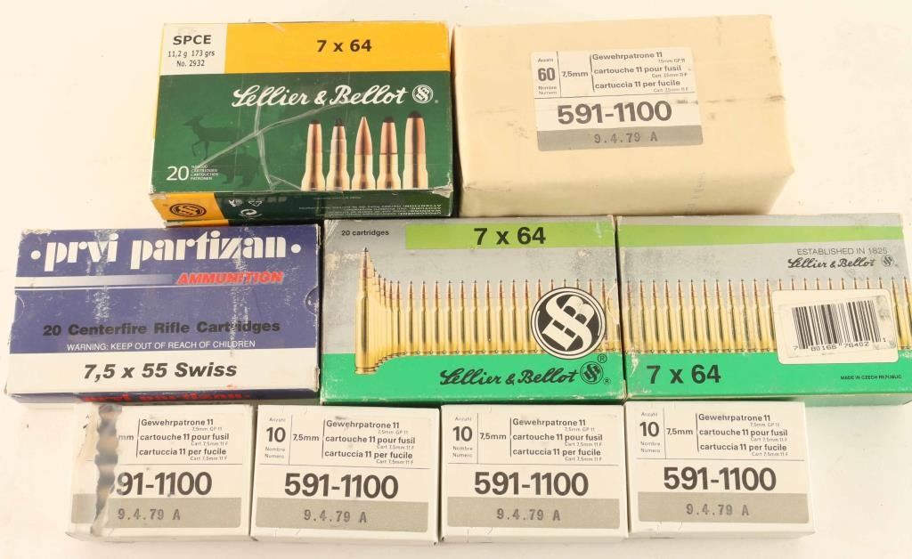 (1) 4 boxes, 80 rounds total of Lellier & Bellot 7 X 64 (1) 1 box, 20 cartridges of .prvi partizan. 7.5 X 55 Swiss (1) 100 rounds total of Gewehrpatrone 7.5mm 591-1100, in boxes, new