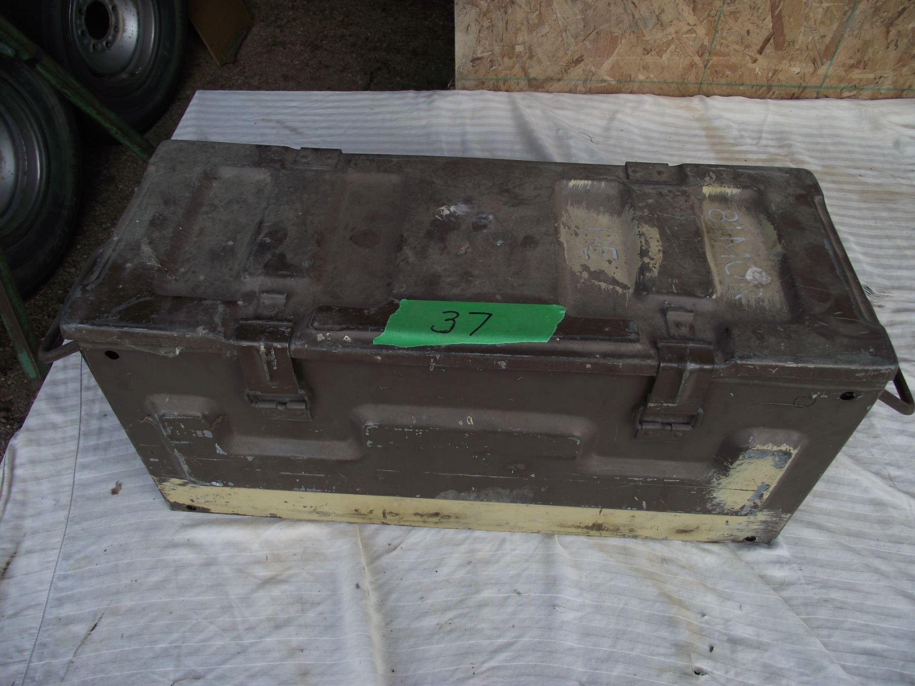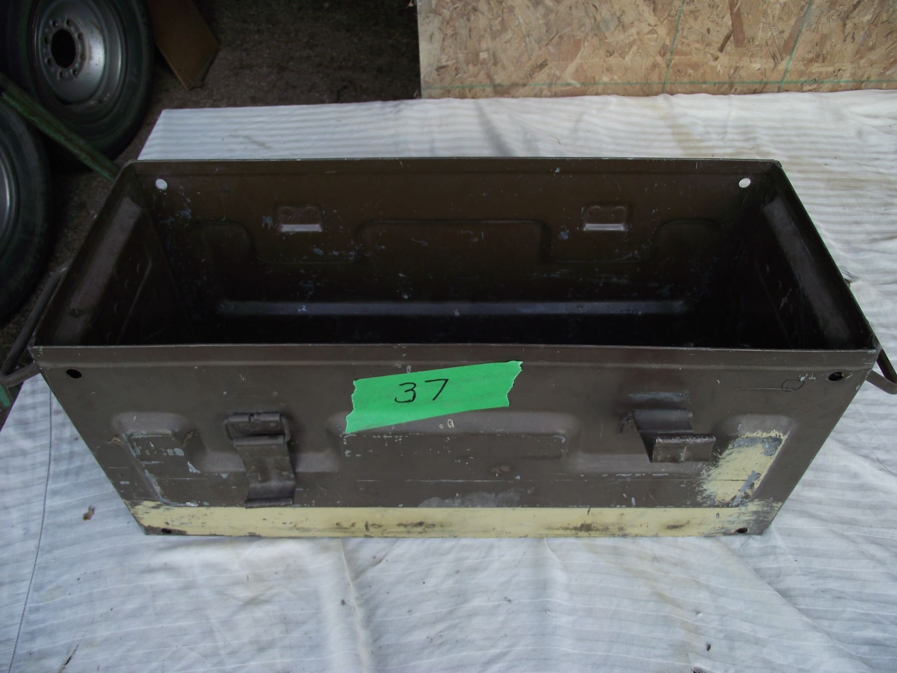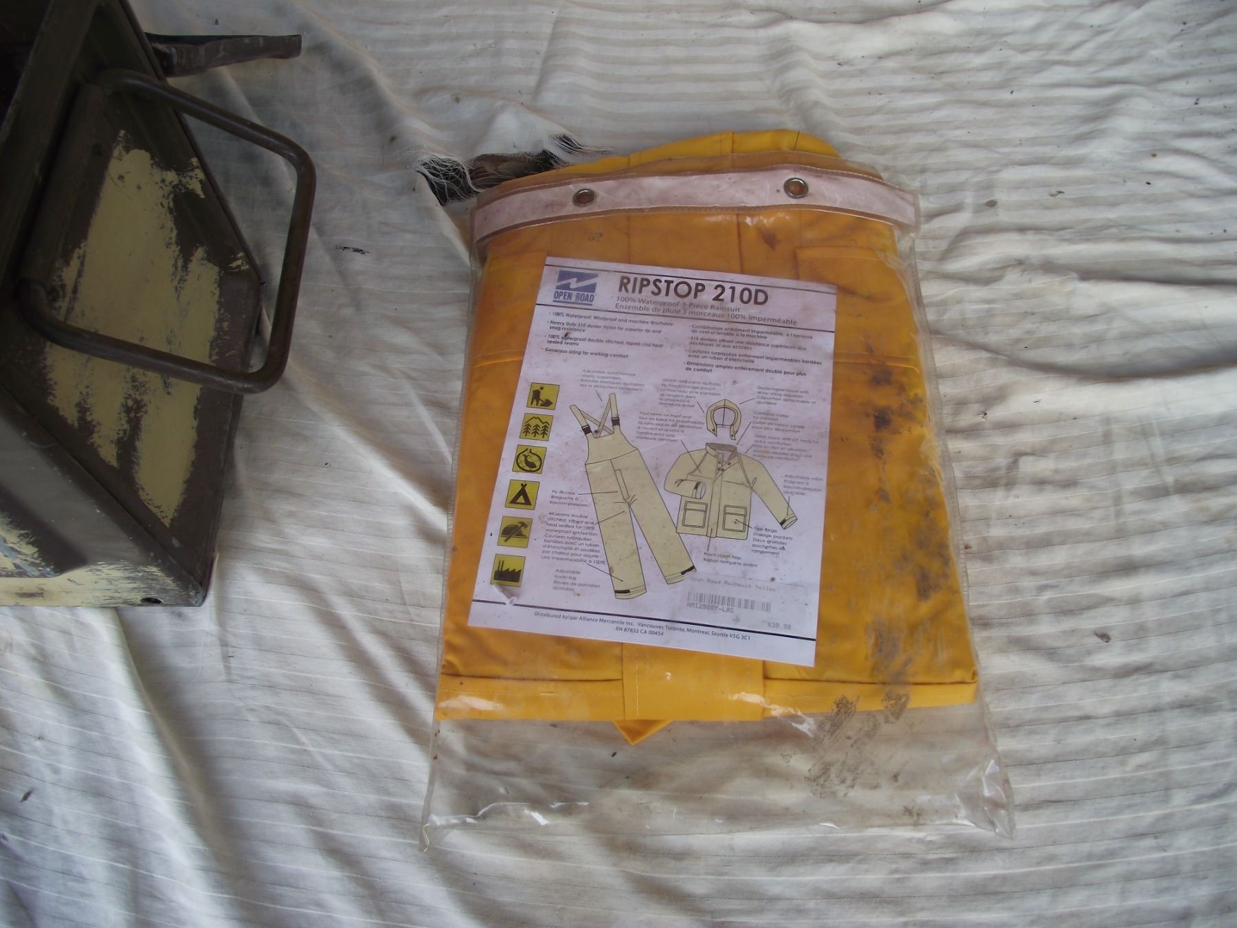Ammo box, nice and straight, not beat up. Works fine. One complete set of rain gear. (New) LRG size.