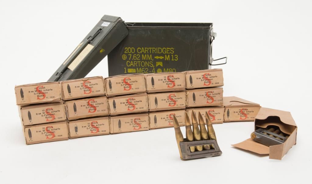 Ammo lot consisting of 17 Nazi marked boxes of Austrian 8mm Mannlicher cartridges. Each box contains two 5 round stripper clips. The boxes are Nazi marked and dated 1938. A total of 170 rounds all in a military ammo can. Est.:$250-$500.