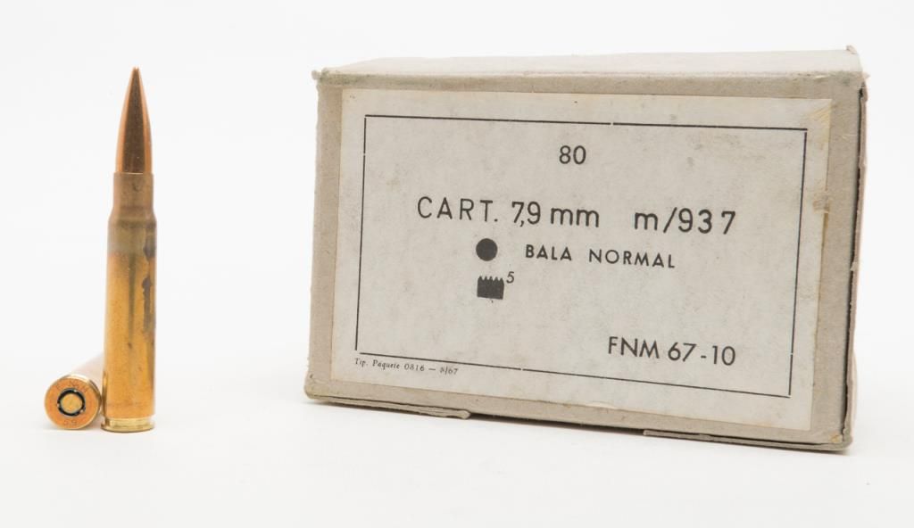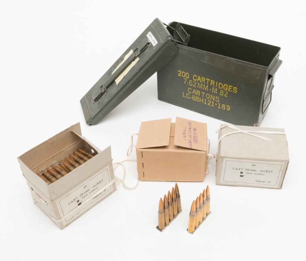 Ammo lot consisting of three boxes of FN arsenal loaded 7.9 mm ammunition. Each box contains 80 rounds, two of the boxes are loaded on stripper clips and the third is loose rounds. 240 rounds total in the lot all packed in a green metal ammocan. A nice lot for the 8mm Mauser shooter. Est.: $100-$200.