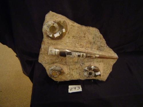 Large Ammonite Fossil Bed with three coiled and one spine view fossil. Nice speciman. Comes with black iron stand. From Marocco.