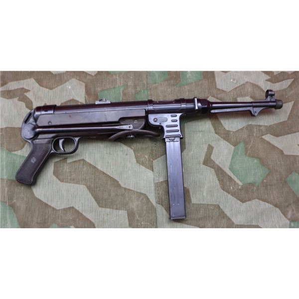 #95580; 9mm. std config. code fxo 41 (C.G. Haenel maker) beneath MP 40 markings. All visible numbers are matching & gun has numerous German waffenamts. Original blue finish has some light spots & marks, folding stock is in good working order, magazine is in fair condition & marked MP38u.40. Gun has an original muzzle cap & good bore. Overall, a very good example of an original WWII bring back MP40. Gun was Amnesty registered & has been with the same family until this point. NATIONAL FIREARMS ACT MG REQUIRING BATF TRANSFERING BEFORE TAKING POSSESSION. FULLY TRANSFERABLE, CURRENTLY ON FORM 4 WITH AUCTION COMPANY.