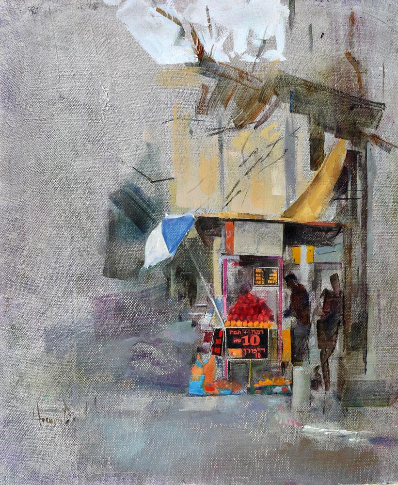 Amnon David Ar, Israeli Art, B. 1973, The Kiosk, Oil on canvas mounted on board, 30x25cm, Signed., , , , ,