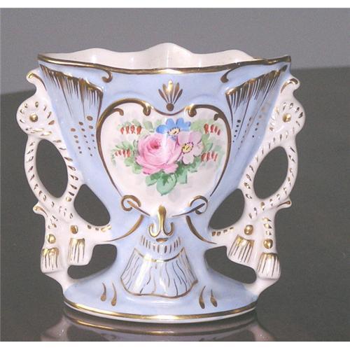 "Amoges Hand Painted"?? These were Limoges blanks, made in France, and brought to the US for painting between 1910-1920. Wonderful quality, but not so costly as Limoges. Beautiful blue background edges the white shield with its bouquet of roses. Gilt accents along the top. Excellent condition, with no nicks or cracks. After 25 years in this business, we will be closing our shop. All prices have been greatly reduced, and we would consider all offers.