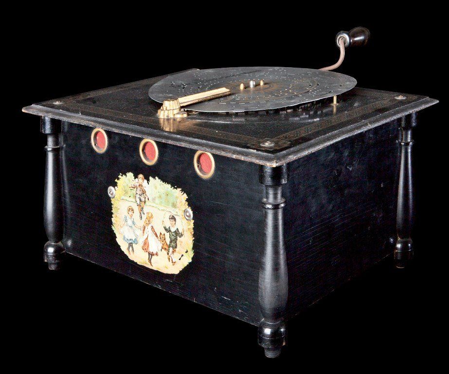 Amorette. Zungenorgel für den Hausgebrauch. Preis 7.75 Mark. Mehr als 50'000 Stück wurden um die Jahrhundertwende verkauft. Museumsqualtität. 36 x 26,5 x 18cm. Rheinische Musik-Manufaktur F.Gottschalk, Germany, circa 1905.