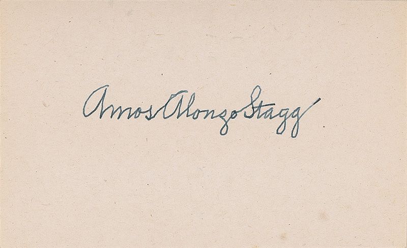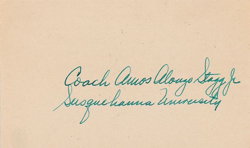 Vintage ink signatures, “Amos Alonzo Stagg” and “Coach Amos Alonzo Stagg, Jr., Susquehanna University,” on individual off-white 5 x 3 cards. In fine condition, with light overall toning.