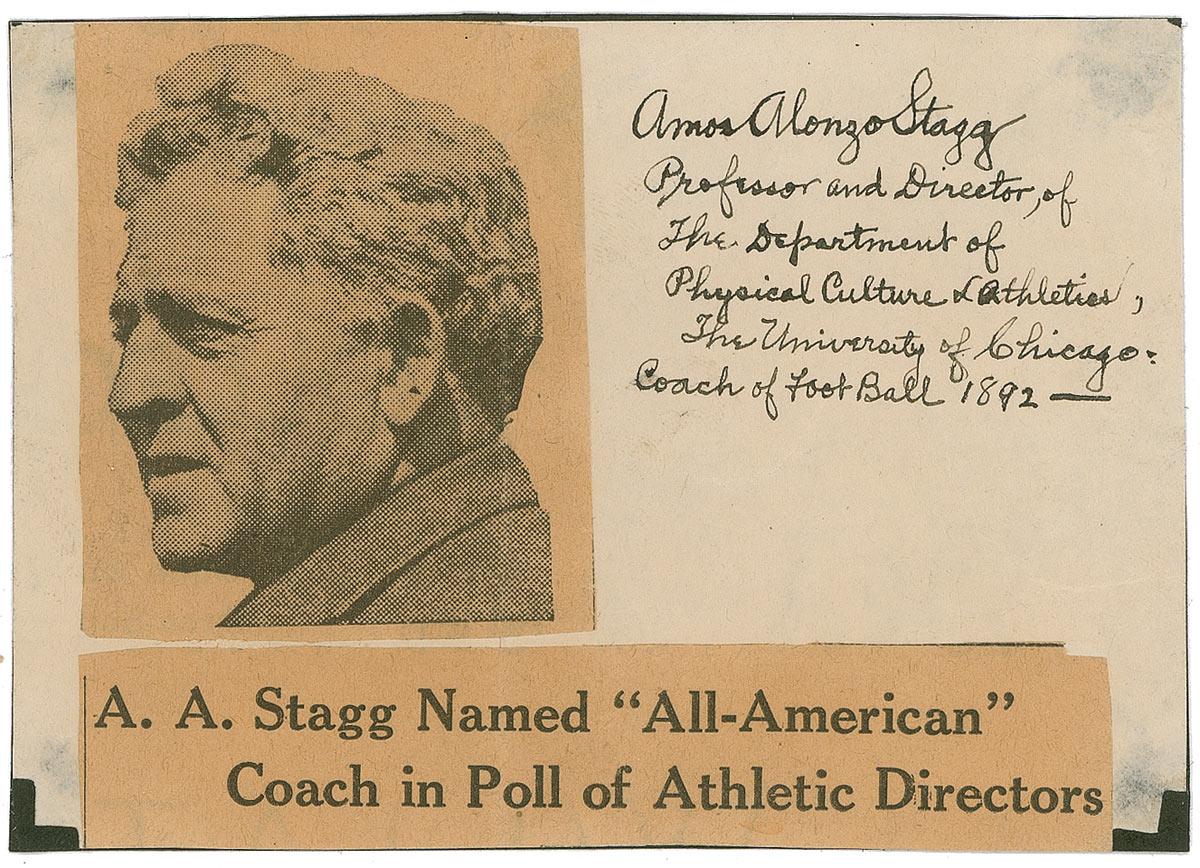 Renowned athletic coach (1862–1965) whose versatile skills earned him places in both the College Football Hall of Fame and the Basketball Hall of Fame. Vintage ink signature, “Amos Alonzo Stagg, Professor and Director of the Department of Physical Culture & Athletics, The University of Chicago; Coach of Football 1892,” on an off-white 5 x 3.5 album page, with a clipped photo and caption affixed to page. Page is affixed to an identical size black sheet. In fine condition, with light corner toning from adhesive on reverse, and small corner mounts to bottom corners