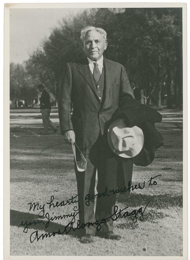 Renowned athletic coach (1862–1965) whose versatile skills earned him places in both the College Football Hall of Fame and the Basketball Hall of Fame. Vintage matte-finish 5 x 7 photo of Stagg posing outdoors, signed and inscribed in fountain pen “My hearty good wishes to you, Jimmy, Amos Alonzo Stagg.” In fine condition, with a spot of trivial toning to top left corner tip.