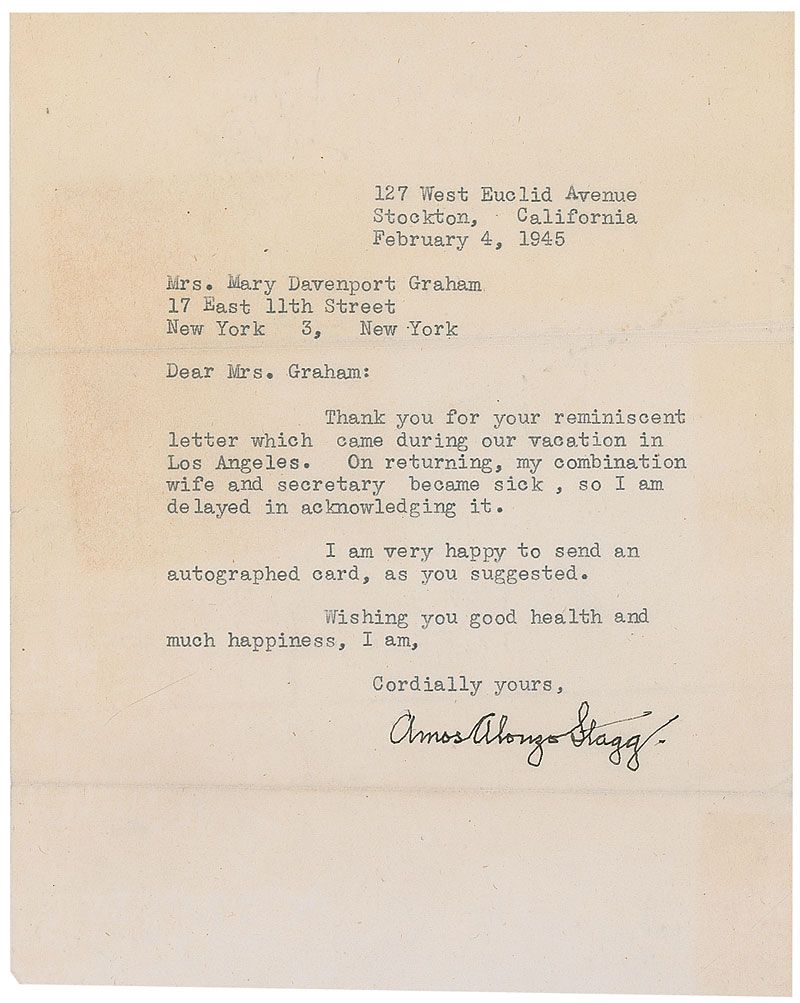 TLS, one onionskin page, 5.5 x 6.75, February 4, 1945. Letter to an admirer. In part: “Thank you for your reminiscent letter which came during our vacation in Los Angeles. On returning, my combination wife and secretary became sick, so I am delayed in acknowledging it.” In fine condition, with some light creases and toning.