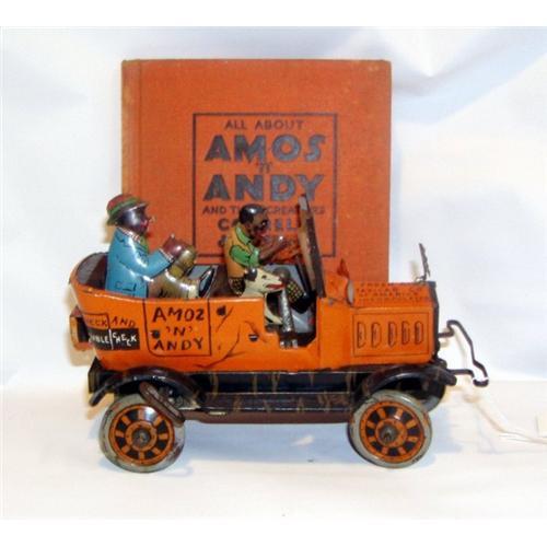 Although some today consider it a racist program, Amos & Andy once reigned supreme in the early days of radio. This tin-litho wind up car celebrates that famous show. I believe this piece comes from the early days of the show, when the open-air taxi played a bigger role in the program. In amazingly good condition, it is all original and all intact. Amos is driving, with a dog in the front seat with him. Andrew H. Brown inhabits the back seat, and both figures bounce up and down, while the wacky front wheels cause the car to sway back and forth when it moves. There are an impressive array of little details on this toy that contribute to its character--lots of writing, a horseshoe hood ornament, a taxi meter flag on the rider's side, an a crank in the front. I will be glad to supply a detailed description of the wear, but in general, there is moderate wear to the wheels, and some light rust inside. This toy comes with a book titled "All About Amos & Andy and thier Creators, Correll & Gosden" published in 1930. The wind up key works, but I couldn't get it to move and didn't want to force it. This dealer has an impressive collection of toys. Please visit our GoAntiques site to view the other pieces we have listed.