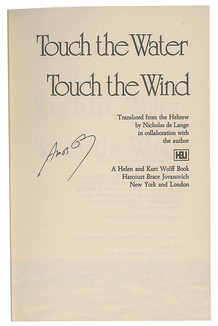 Israeli writer, novelist, journalist, and intellectual (1939–2018) who was a prominent advocate of a two-state solution to the Israeli–Palestinian conflict. Signed book: Touch the Water, Touch the Wind. First English edition. NY: Harcourt Brace Jovanovich, 1974. Hardcover with dust jacket, 5.5 x 8.25, 179 pages. Signed on the title page in black felt tip, "Amos Oz." In fine condition.