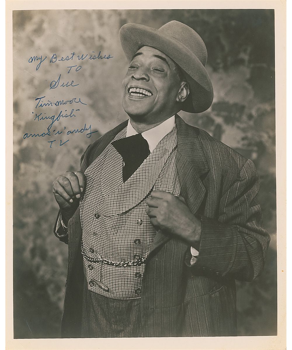 Vintage pearl-finish 8 x 10 photo of Moore in his classic TV role, signed and inscribed in blue ballpoint “My best wishes to Sue, Tim Moore, ‘Kingfish,’ Amos ‘n’ Andy, TV.” Creasing to the corner tips and silvering to dark areas of the background, otherwise fine condition. Moore signed photos are virtually nonexistent, this being the first we have ever seen.