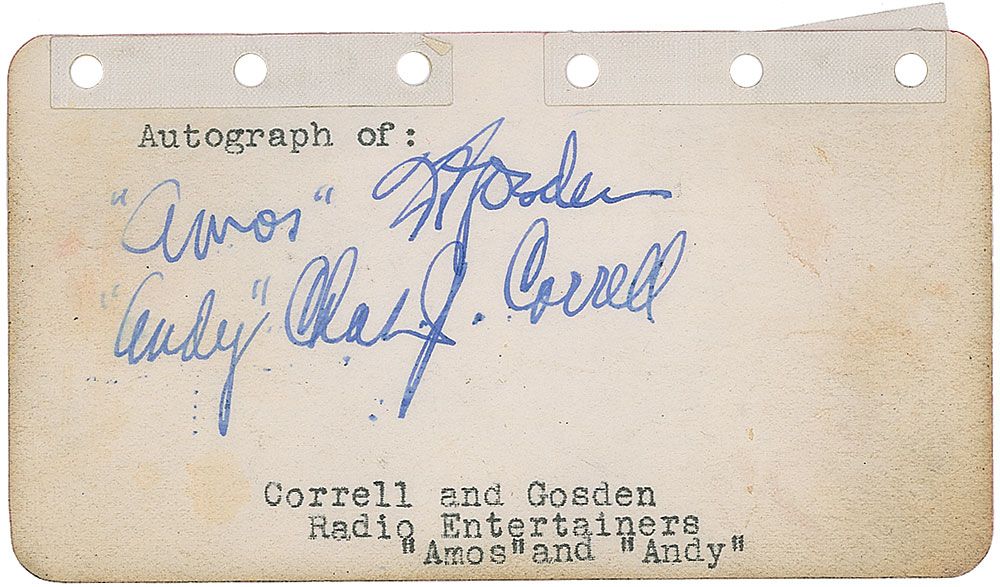 Vintage fountain pen signatures, “‘Amos,’ F. Gosden,” and “‘Andy,’ Chas. J. Correll,” on an off-white 4.5 x 2.5 page. In fine condition, with some scattered light toning and reinforcements to punch holes along top.