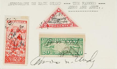 A group of three postage stamps including one from Liberia, one from the United States and one from Russia, all of which are signed by the famous depression era entertainers, Amos 'n Andy. All stamps hinged on single card.