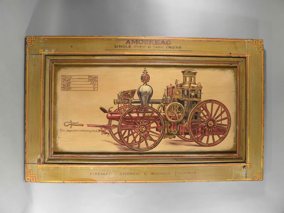 Amoskeag Single Pump U Tank Engine Hand painted Wood Sign. Fireman Andrew L. Buchan (volunteer). In original frame. Purportedly to have come from the lobby of a major insurance company in New York. 39 X 23 1/2 inches.