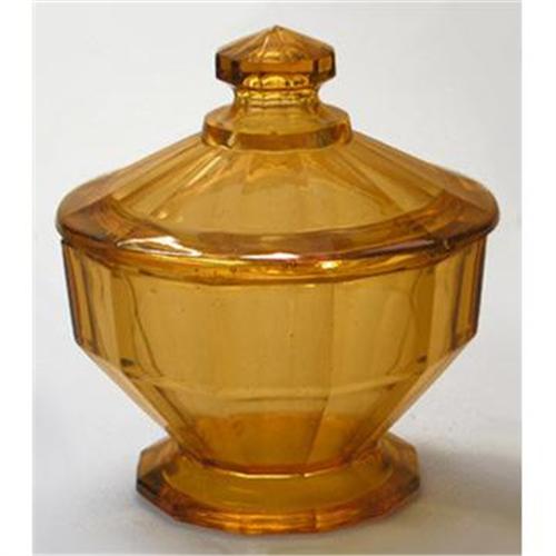 Produced during the 1930s this Art Deco, amber pressed Depression glass, powder jar measures about 4 1/2 inches across and is in excellent condition for its age. Features a jewel like hexagonal shaped finial, a panel optic jar, and a slopping pedestal foot.
