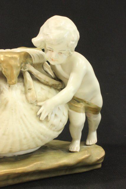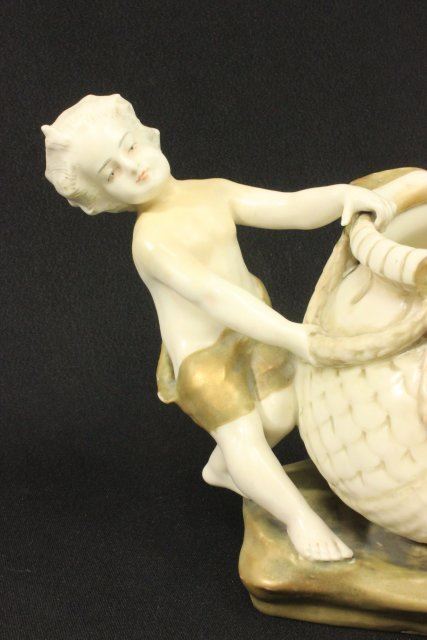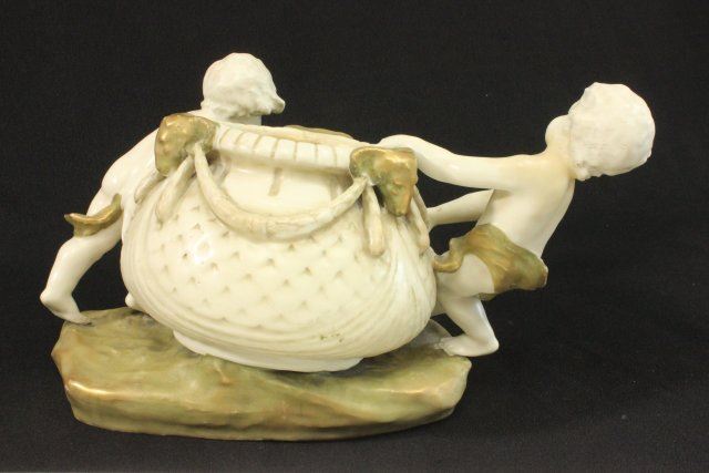 Two cherubs holding basket. Approx. 8" H x 14 1/2" W. Restoration on one cherub.